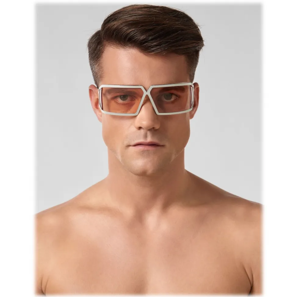 Philipp Plein Skull Collection mask sunglasses. Metal frame sunglasses with squared edges and colored lenses.