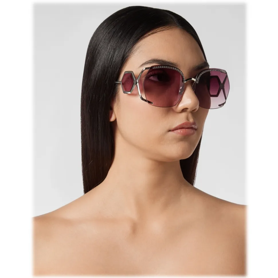 Philipp Plein Statement Oversize Collection sunglasses. Metal frame sunglasses embellished with strass, colored rounded lenses and brand logo aside.