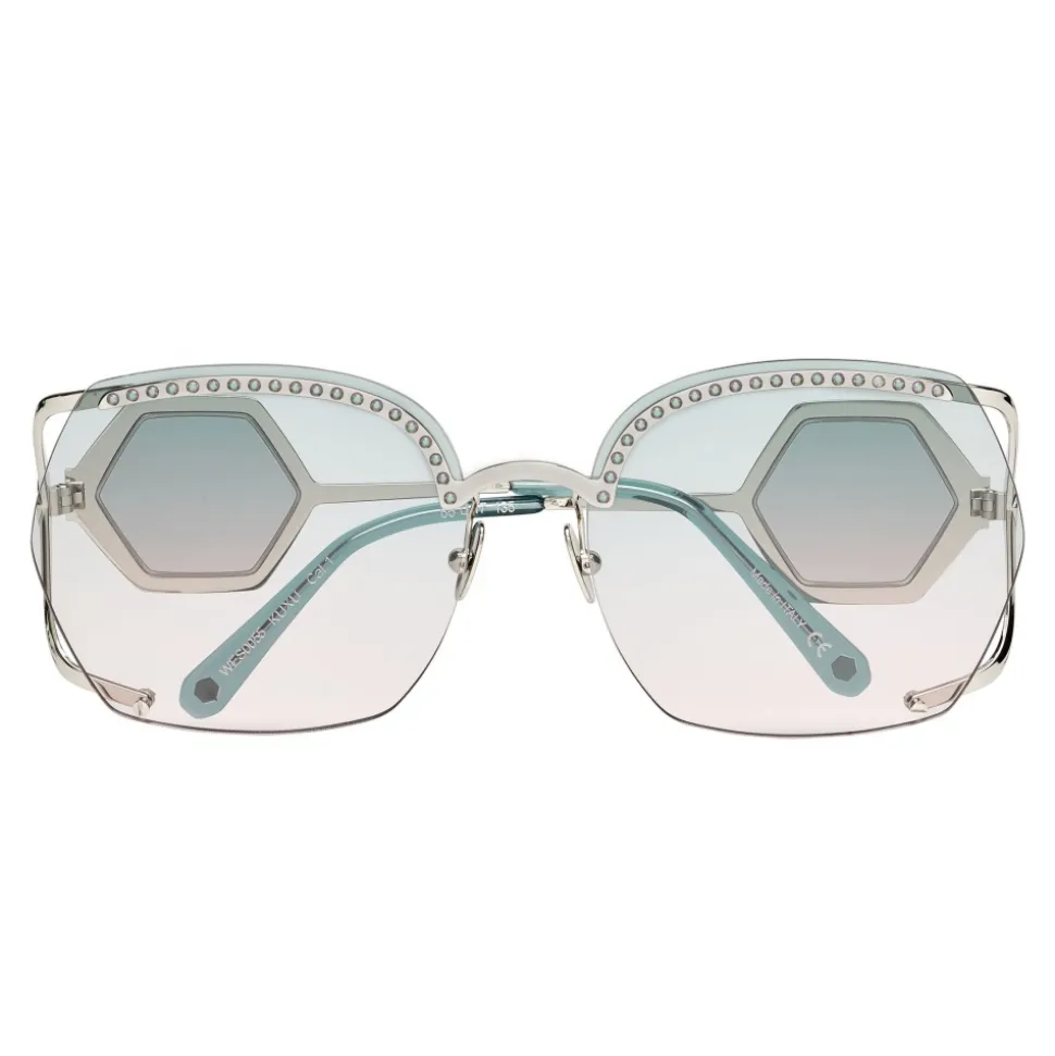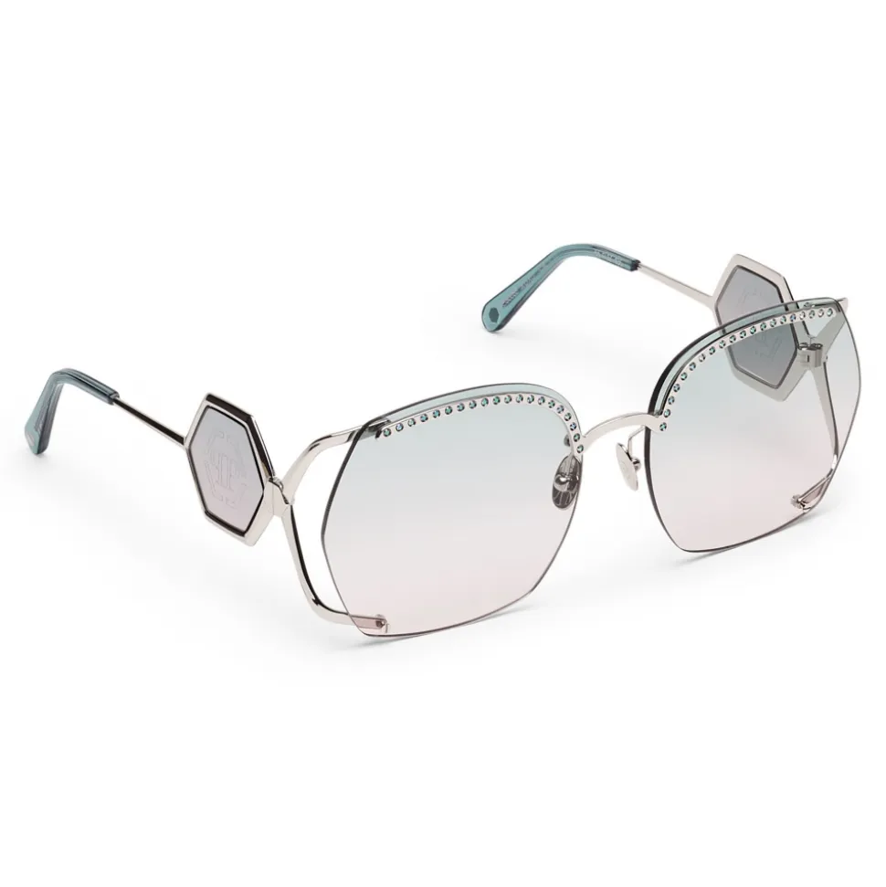 Philipp Plein Statement Oversize Collection sunglasses. Metal frame sunglasses embellished with strass, colored rounded lenses and brand logo aside.