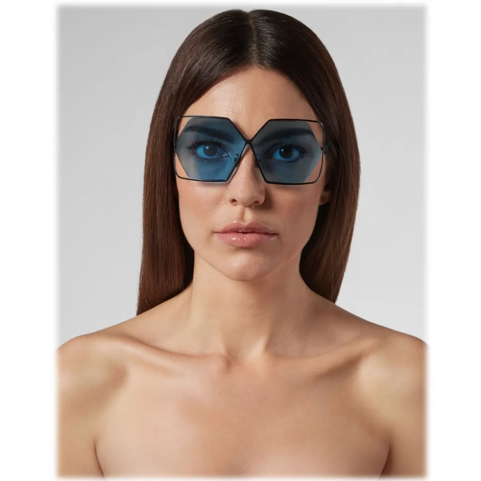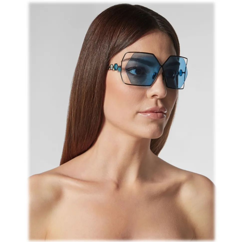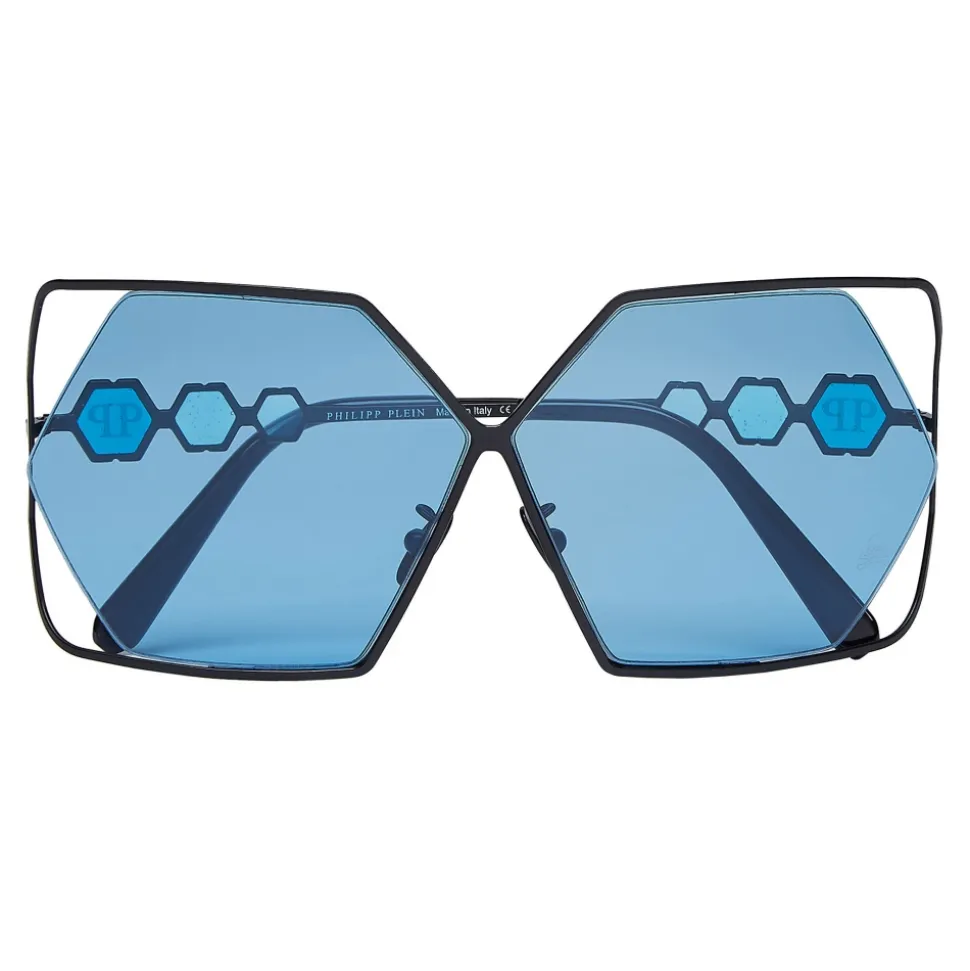 Philipp Plein Tris Collection sunglasses. Metal frame sunglasses with squared edges, colored hexagonal lenses and brand logo aside.