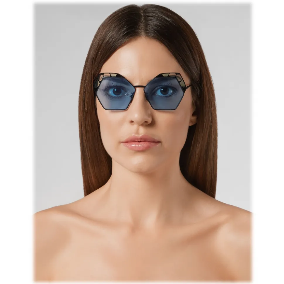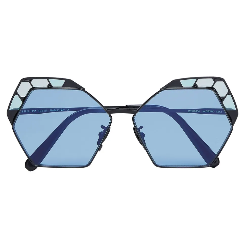 Philipp Plein Vlinder Collection sunglasses. Metal frame sunglasses with hexagonal and colored lenses enriched with embellishments on top.