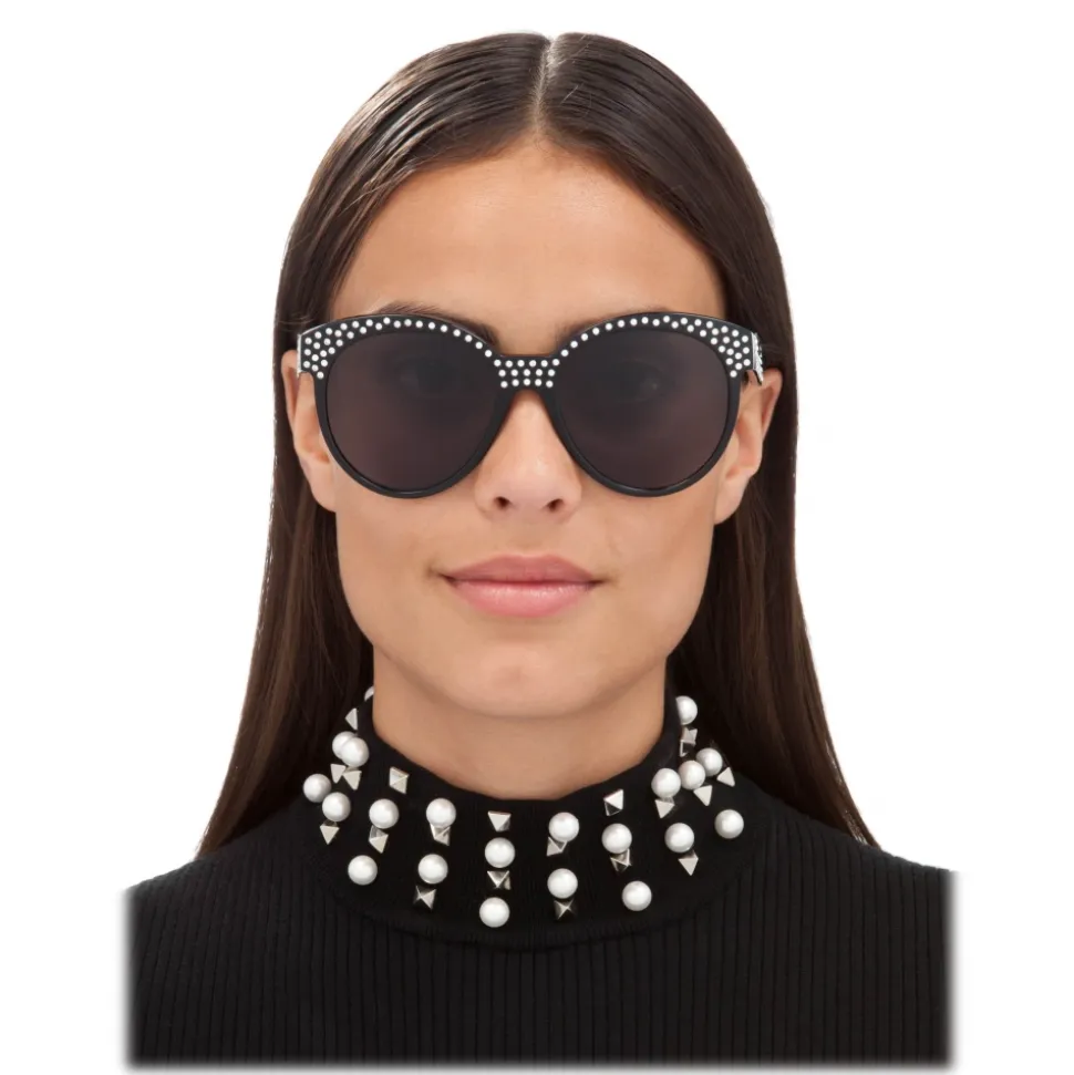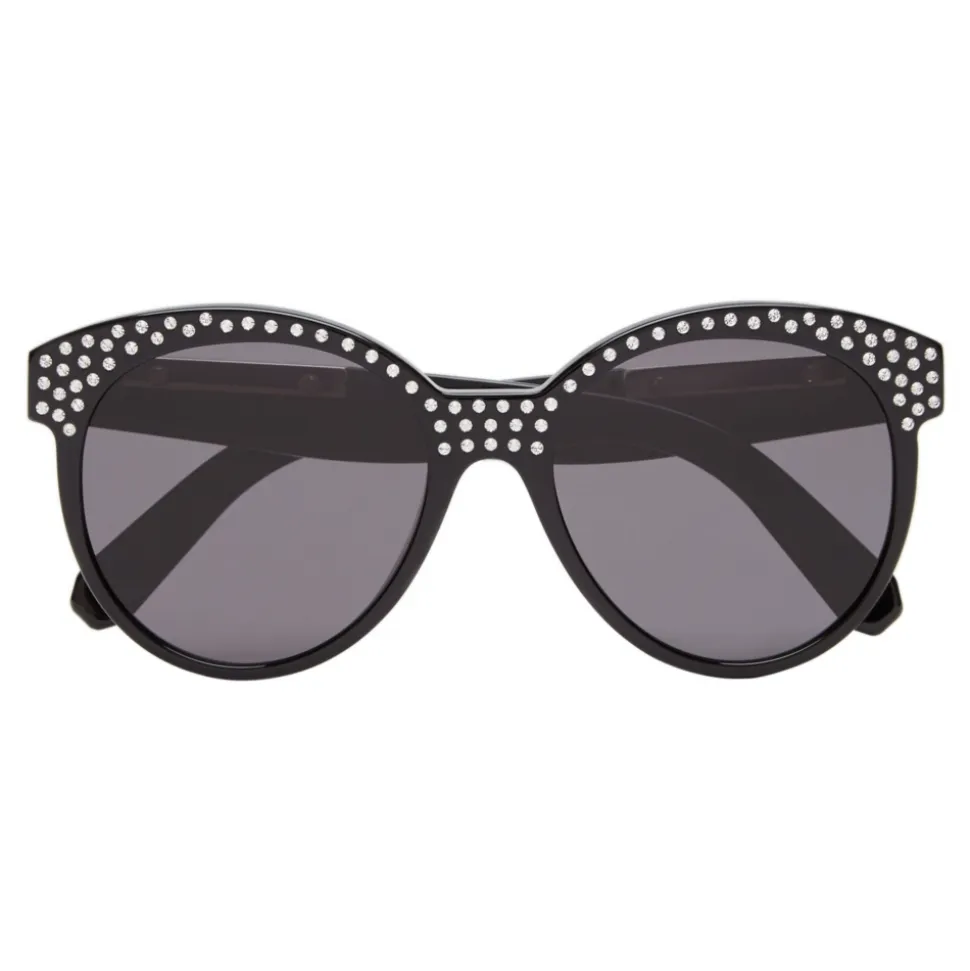Philipp Plein Want Collection sunglasses. Black acetate with rhinestones frame. Classic round timeless model for women.