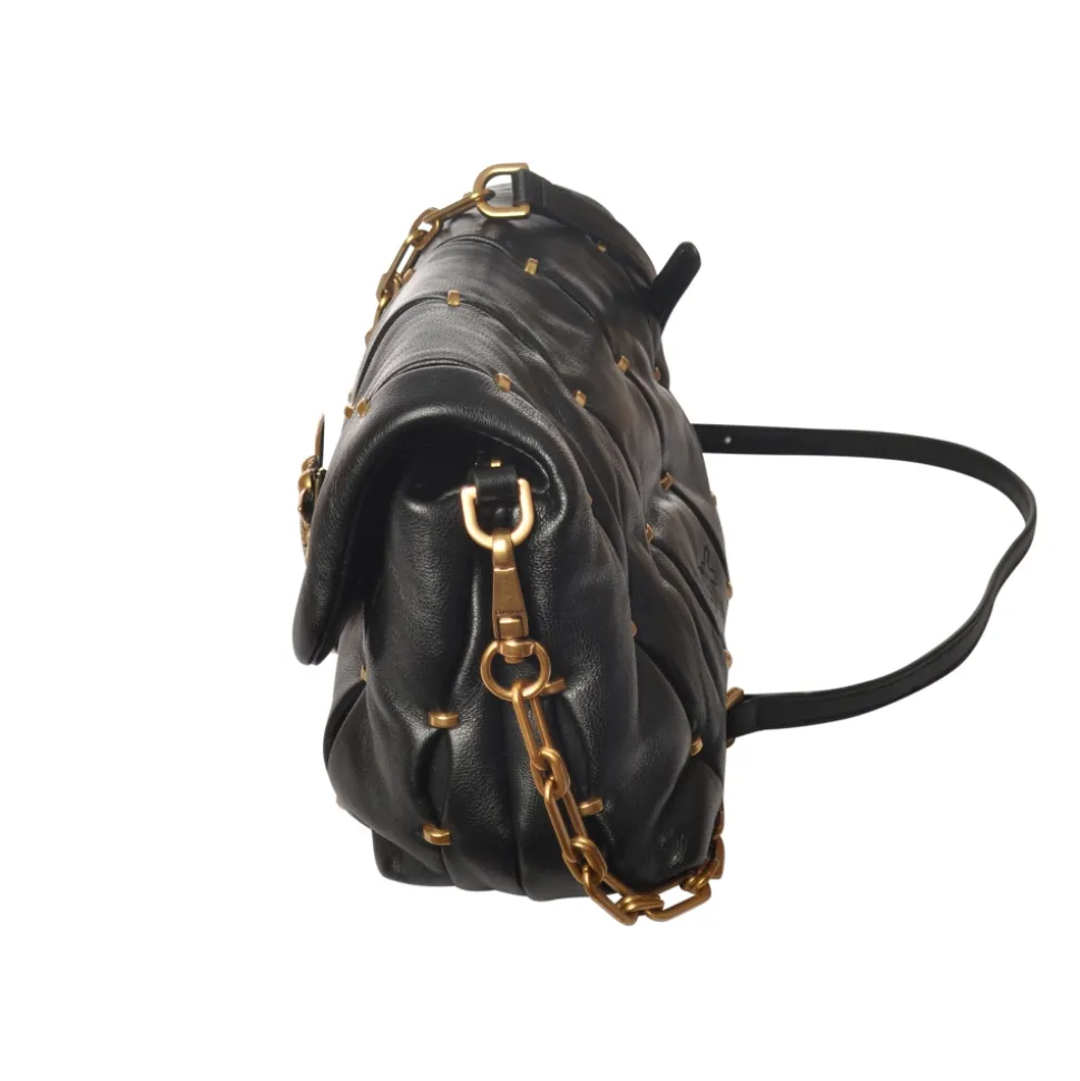 Small rectangular bag, with fine shoulder strap, central closure with gold swallow buckle, entirely made of pinched nappa with gold studs, Pinko.