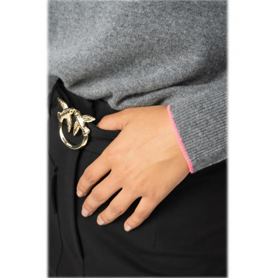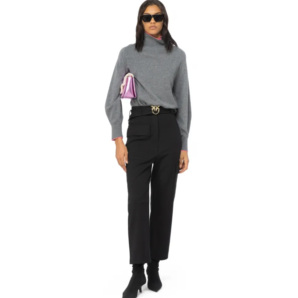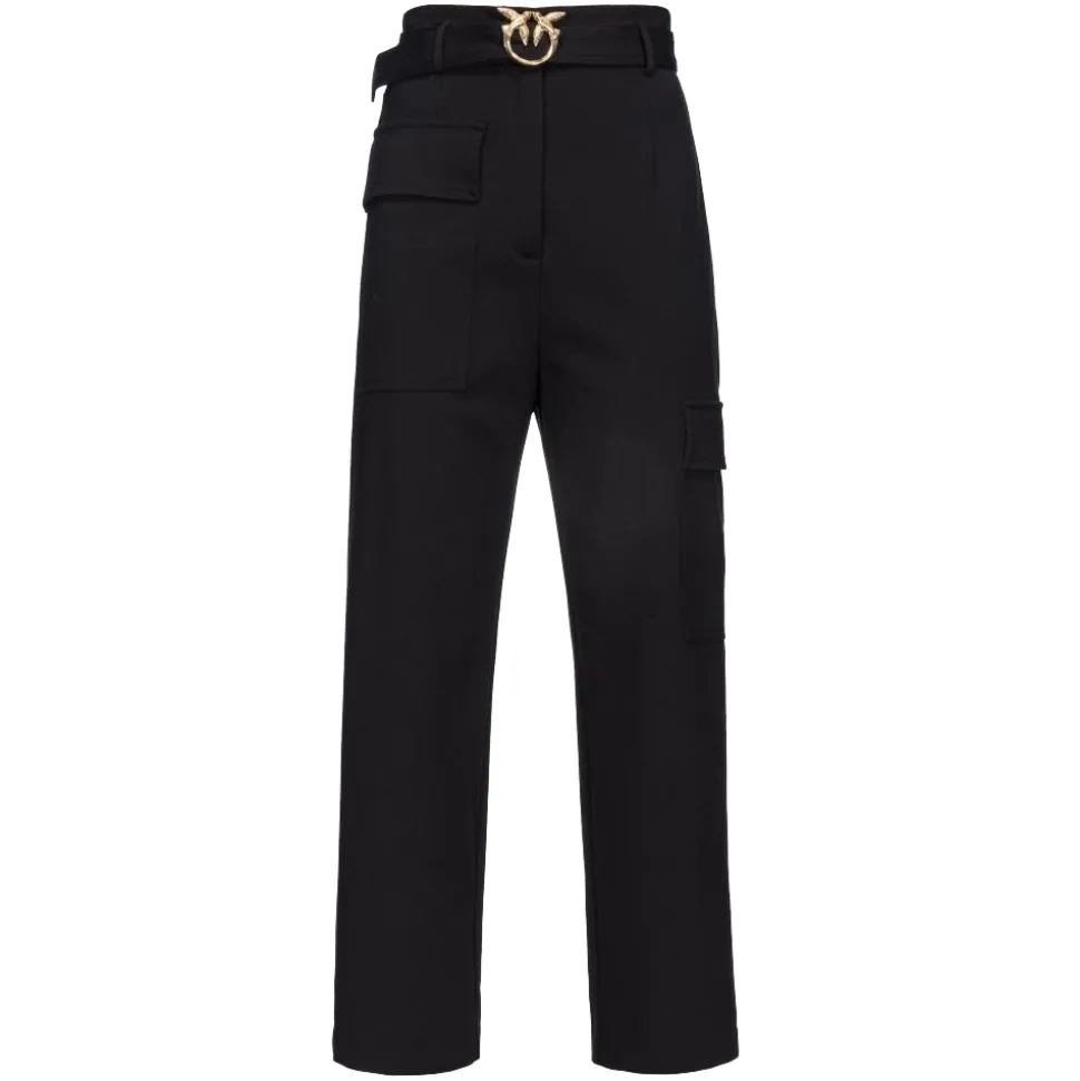 Pinko cargo trousers in technical stretch viscose fabric worked in fabric stitch. High waist with belt loops and matching belt in the same fabric with Love Birds Diamond Cut buckle, inset pockets on the hips and patch pockets on the back. Straight leg. Zip and small hook fastening.