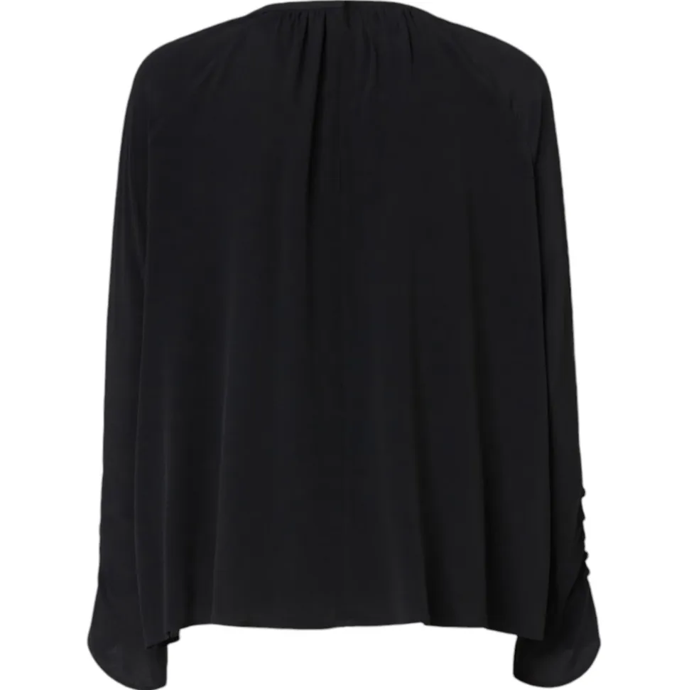 Pinko blouse in mixed silk crepe de Chine. Round neckline with V opening and a drop button fastening at the back. Long raglan sleeves with a row of buttons at the bottom.