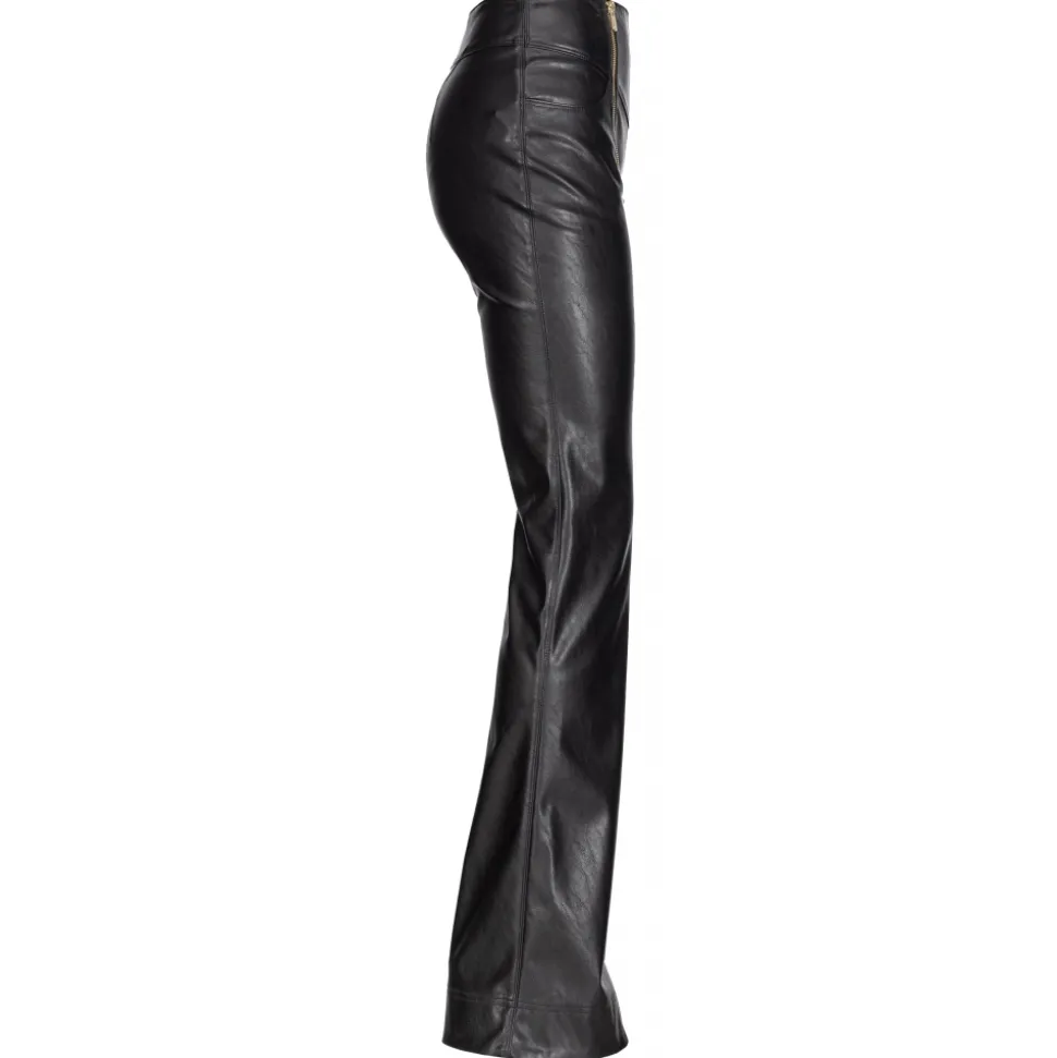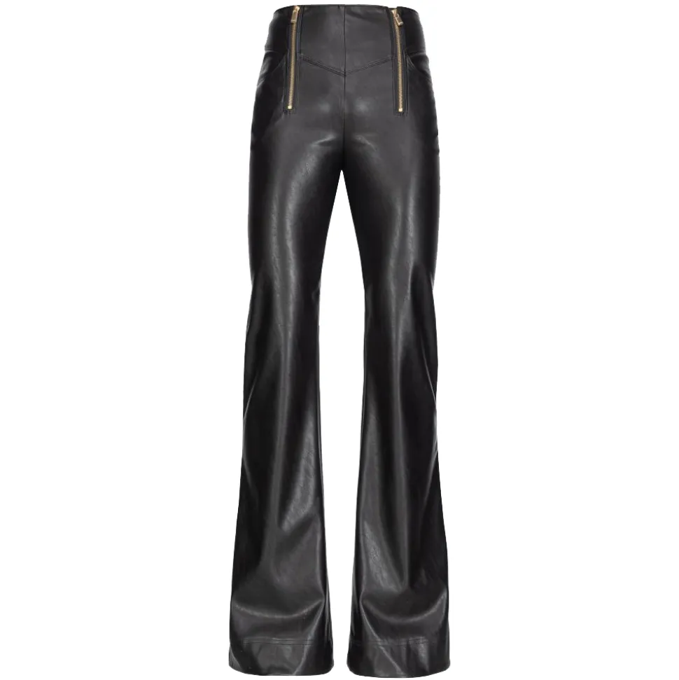 Pinko trousers, flare-fit in leather-effect fabric. High-waisted constructed basque with double metal zip and fitted leg, flared at the bottom.