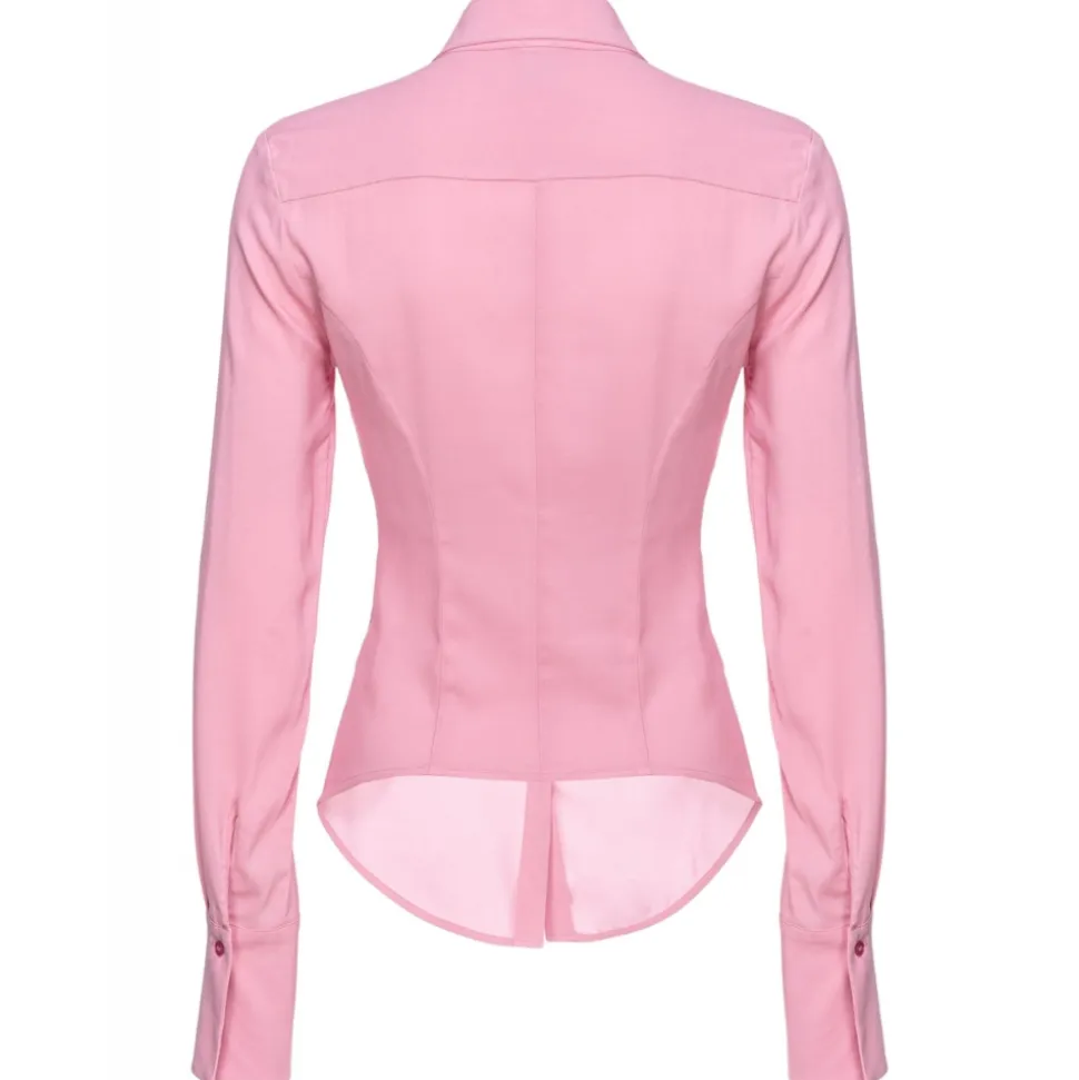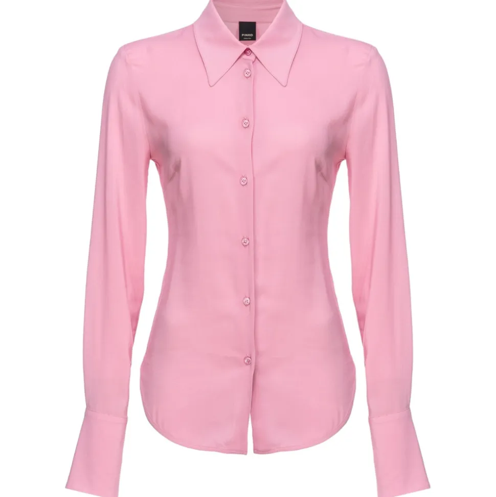 Pinko shirt, crop and fitted model in light stretch georgette. Slim fit, classic collar and long sleeves with cuffs. Colour tone button fastening, asymmetrical hem with longer front hem.