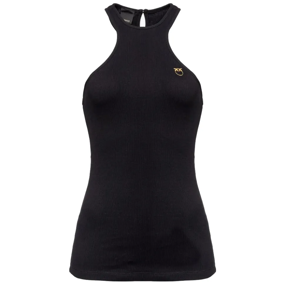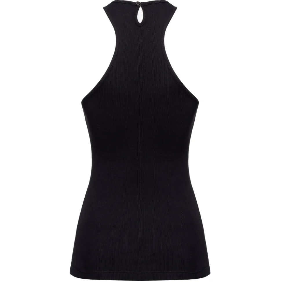 Pinko tank top, close-fitting in a rowing model, made entirely of ribbed cotton, with plated swallows logo on the front.
