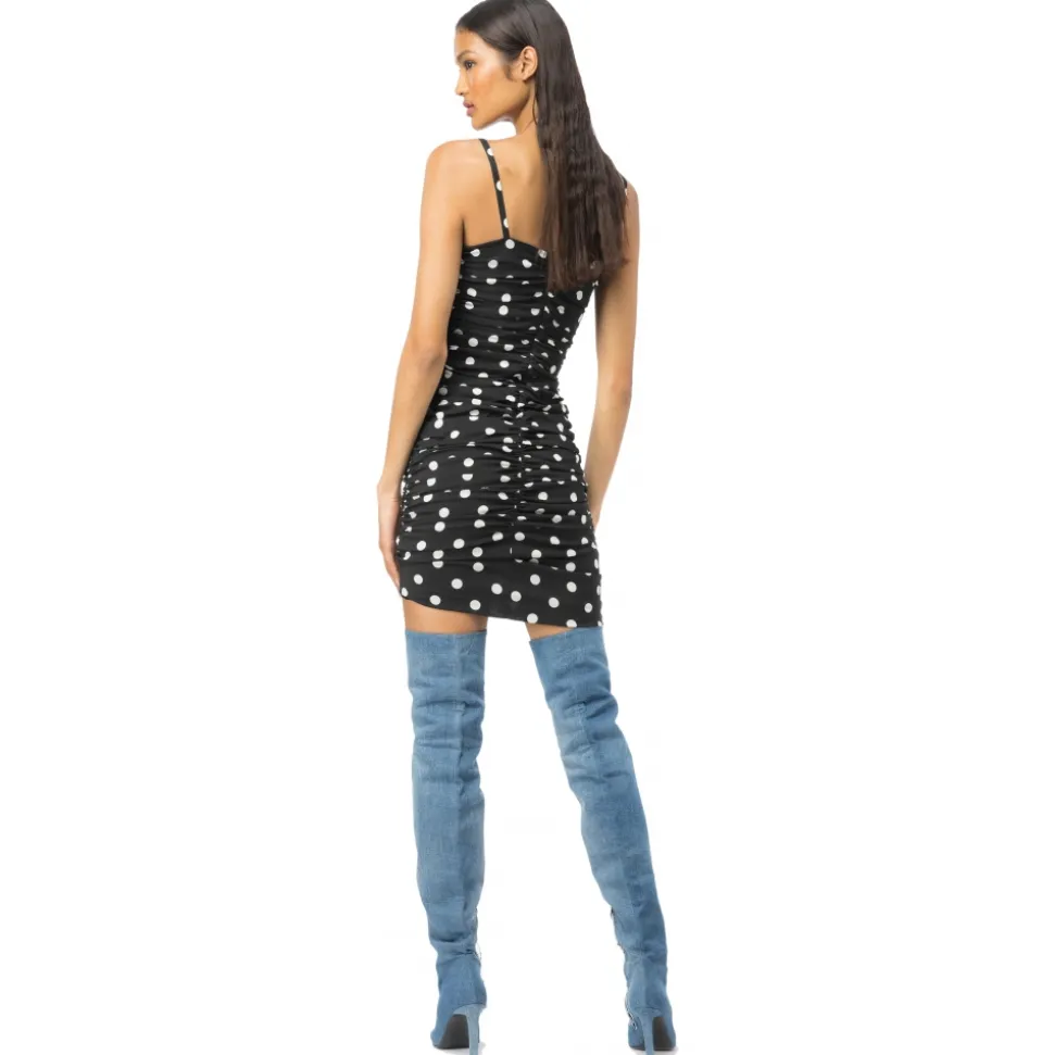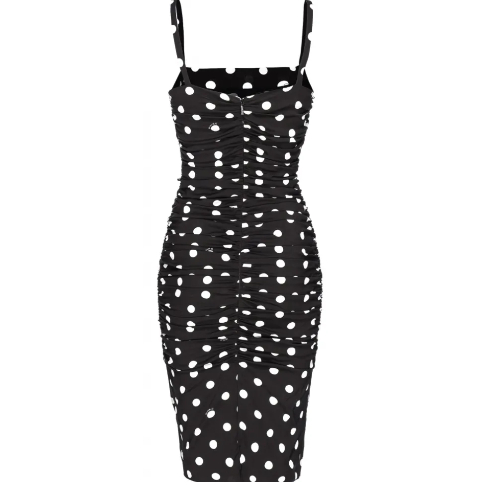 Pinko sheath dress, knee length, with side gathers, entirely made of polka dot pattern.