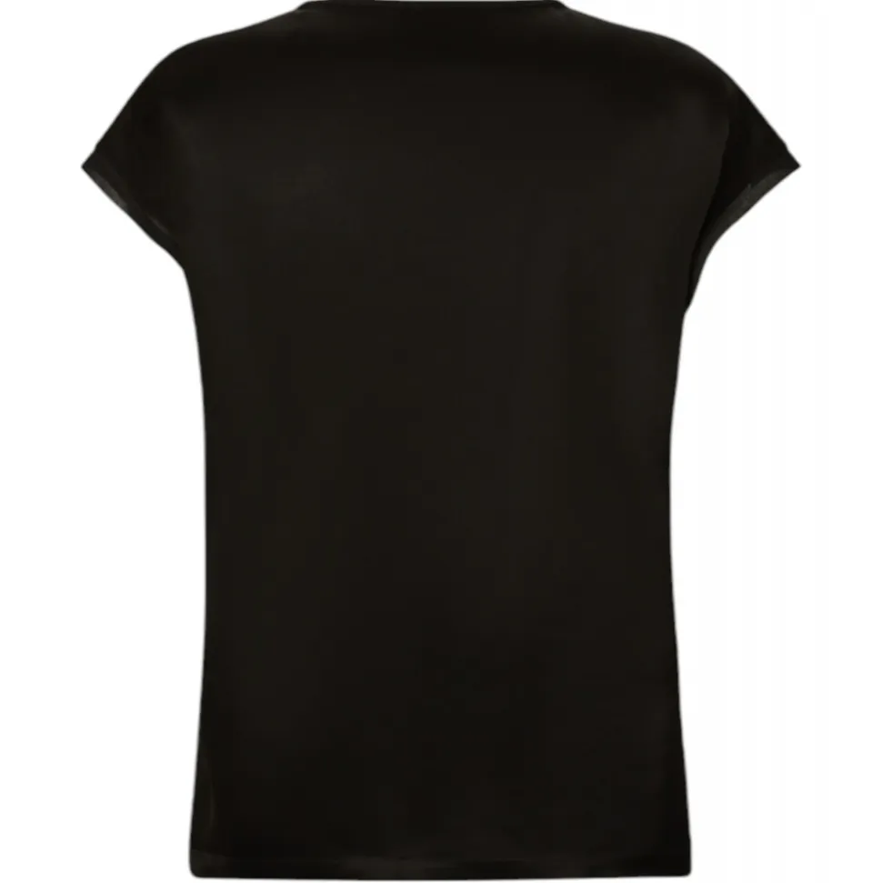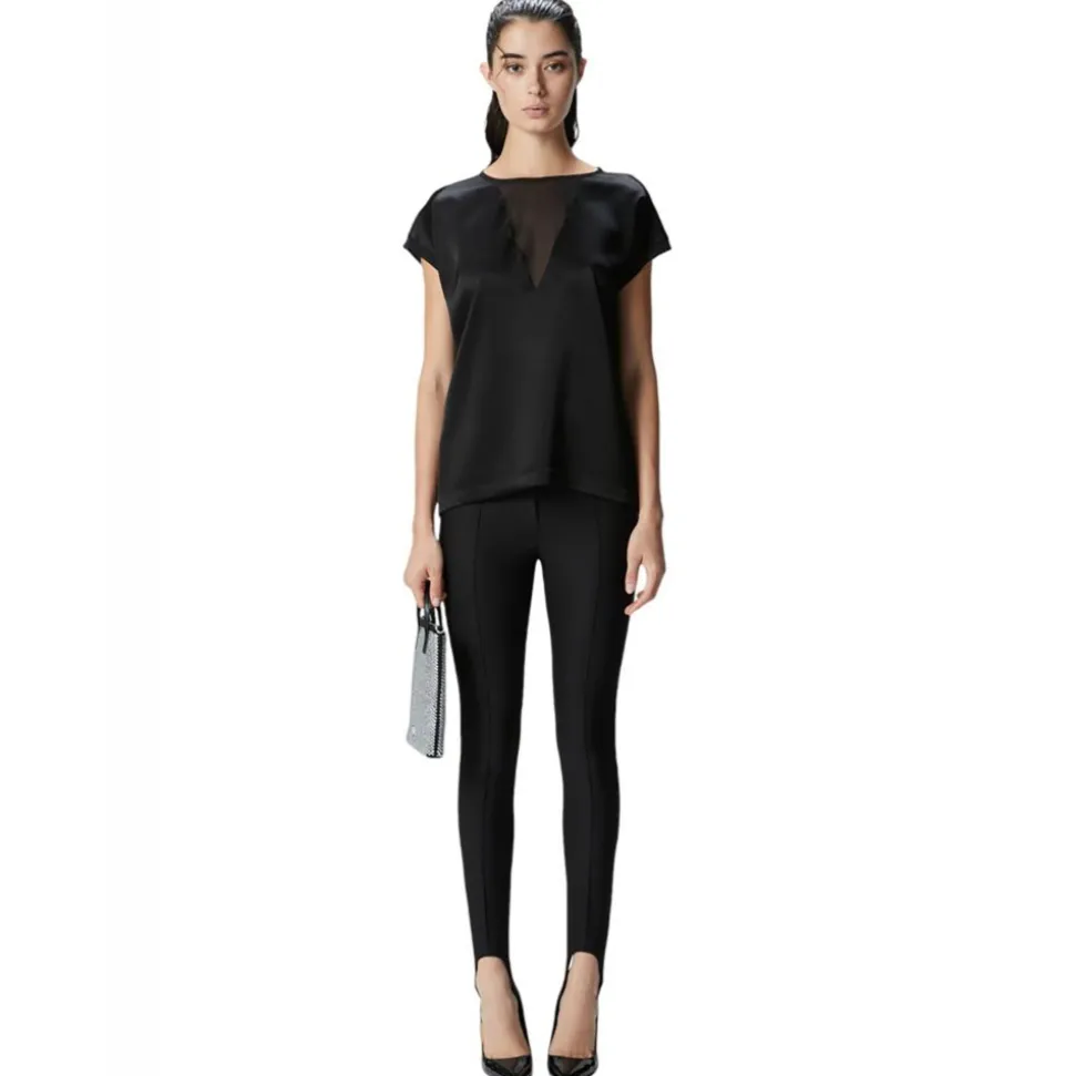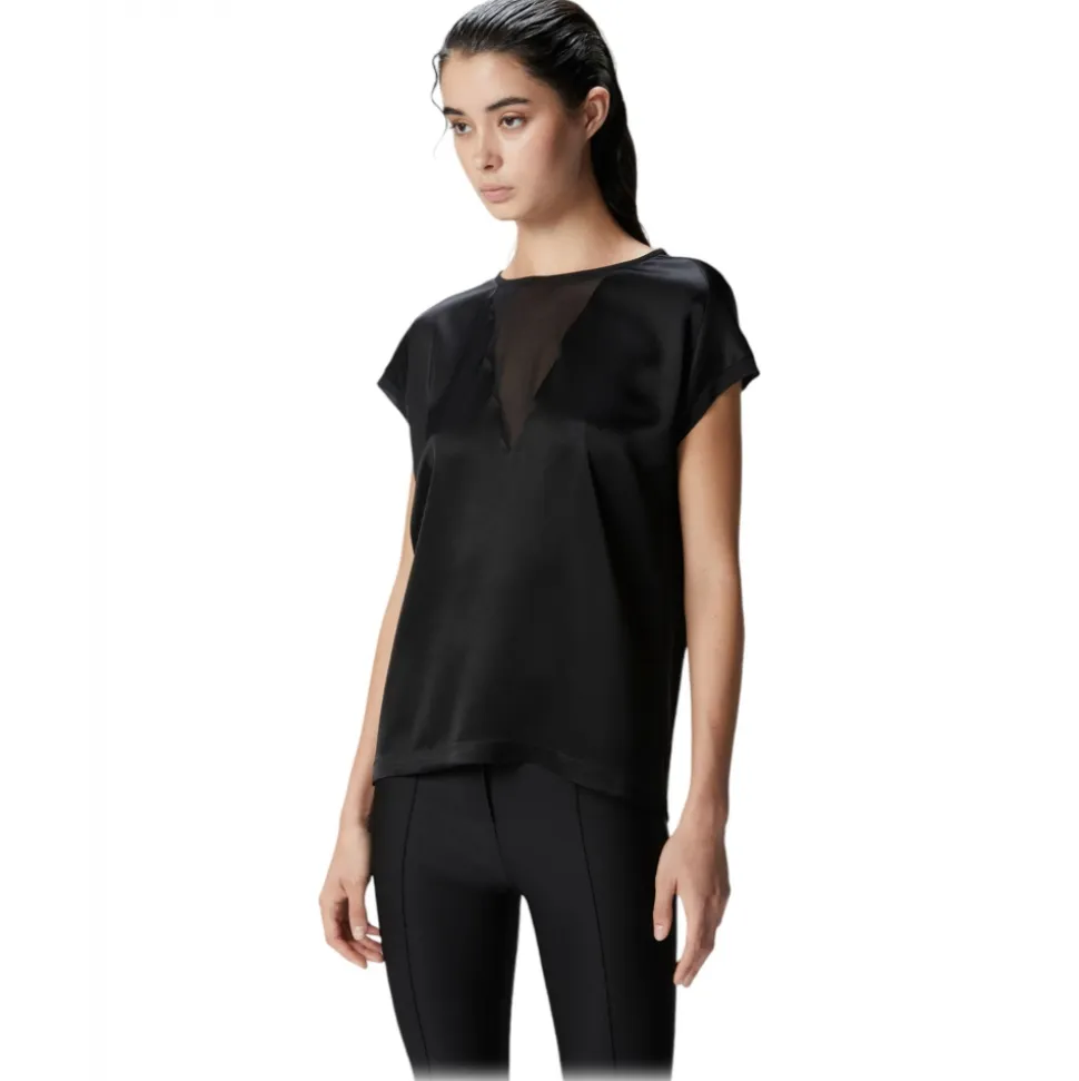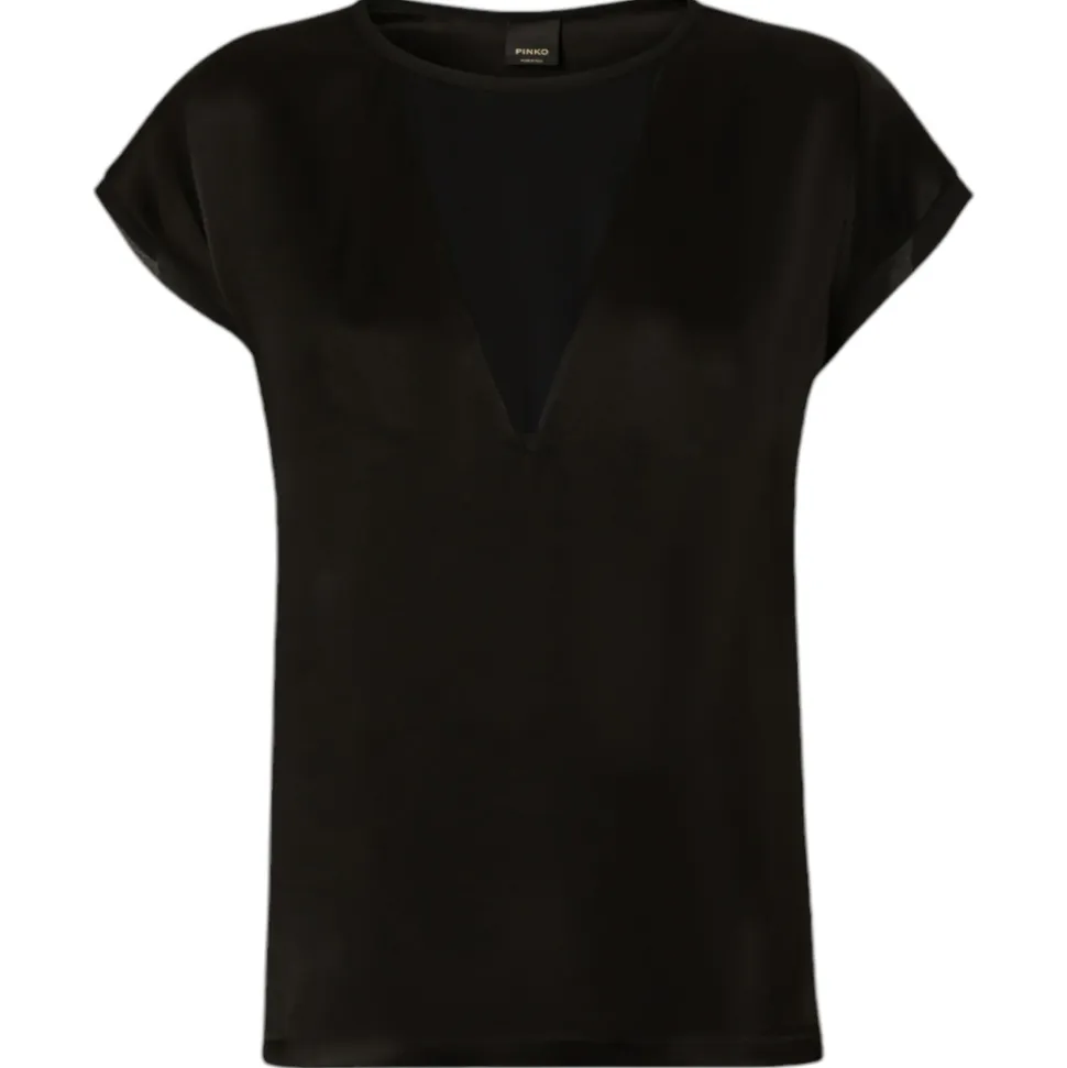 Pinko blouse in shiny satin fabric. T-shirt model with triangular insert in semi-transparent georgette on the front. Round neckline and short wing sleeves.
