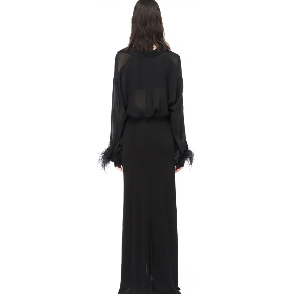 Slightly long cut Pinko shirt in light viscose georgette with feather trimmed cuffs. Classic collar, long sleeves with low rounded sleeves and bottom hem with asymmetrical hem, longer and rounded at the back. Button fastening covered in the same fabric.