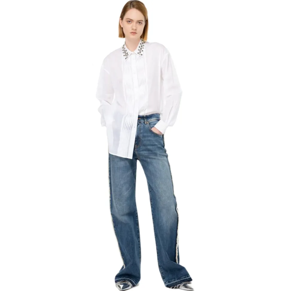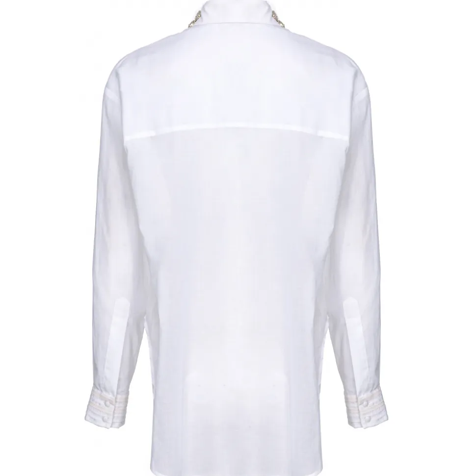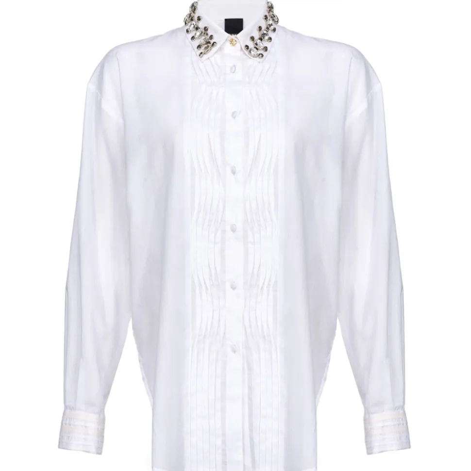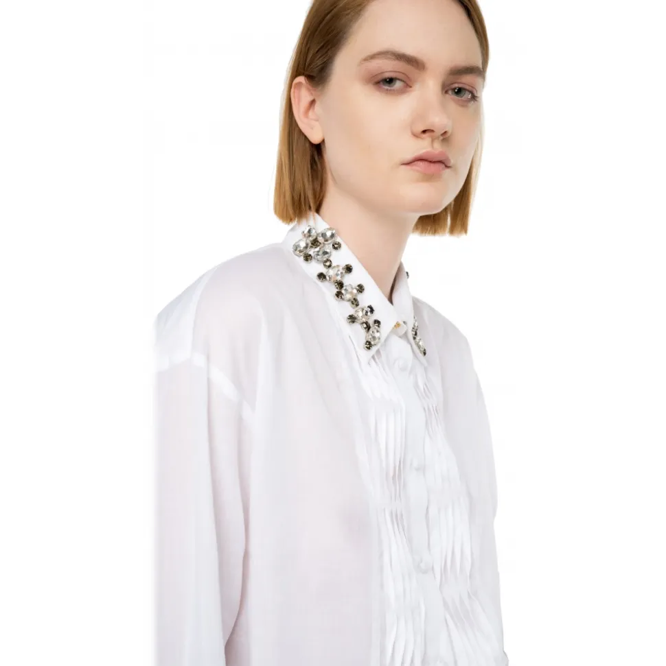 Pinko shirt in cotton muslin with plastron featuring pleated workmanship that creates a wavy effect. Classic collar with handmade jewel embroidery and long sleeves with a slightly low turn with embroidered cuff. Closure with fabric covered buttons, the first one is metal.
