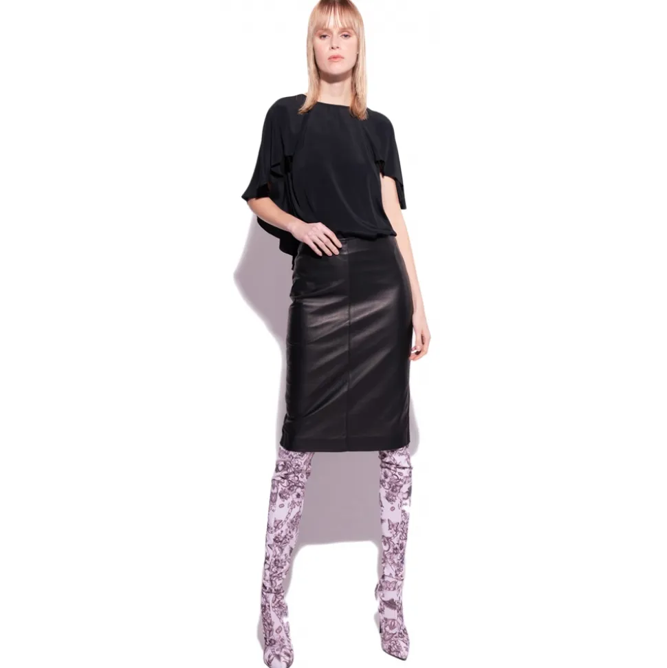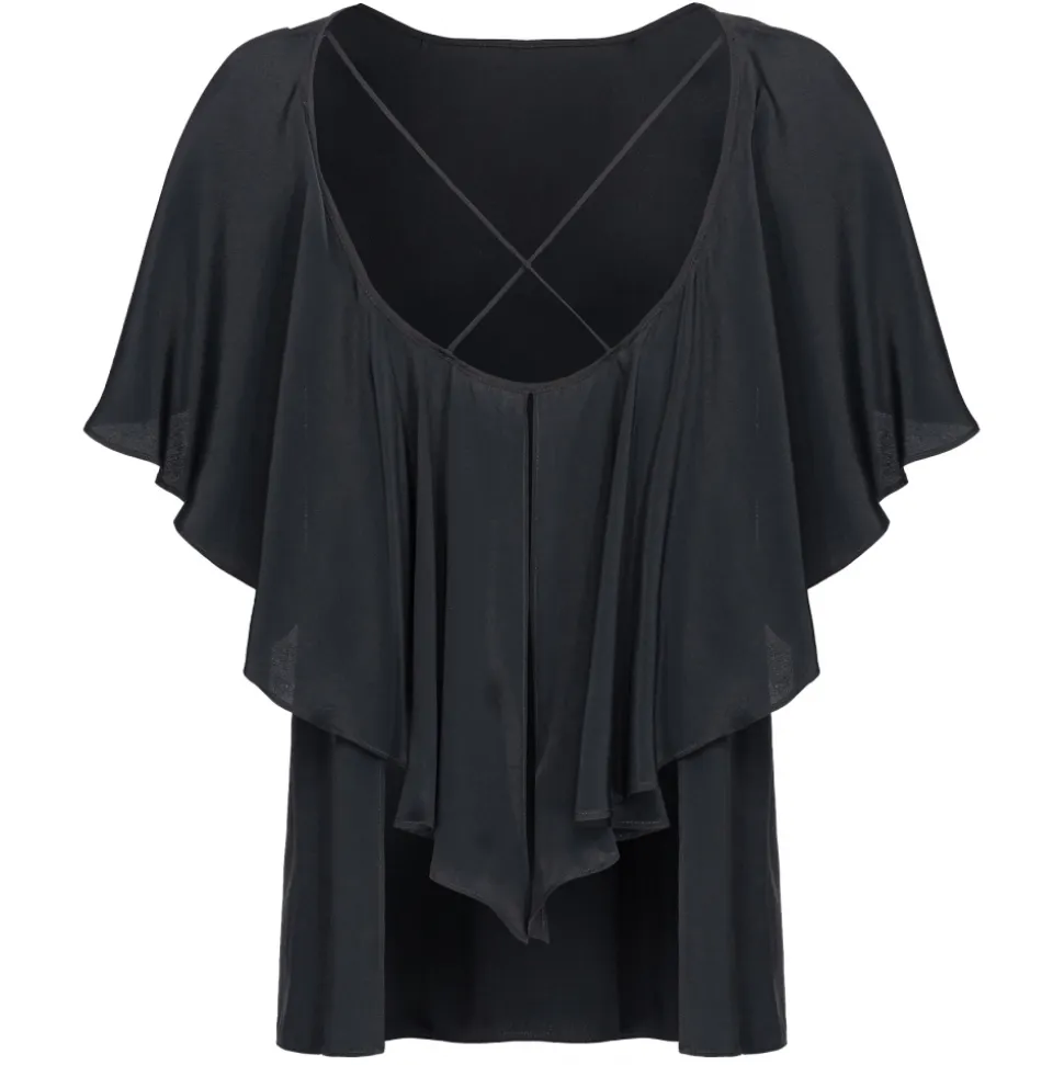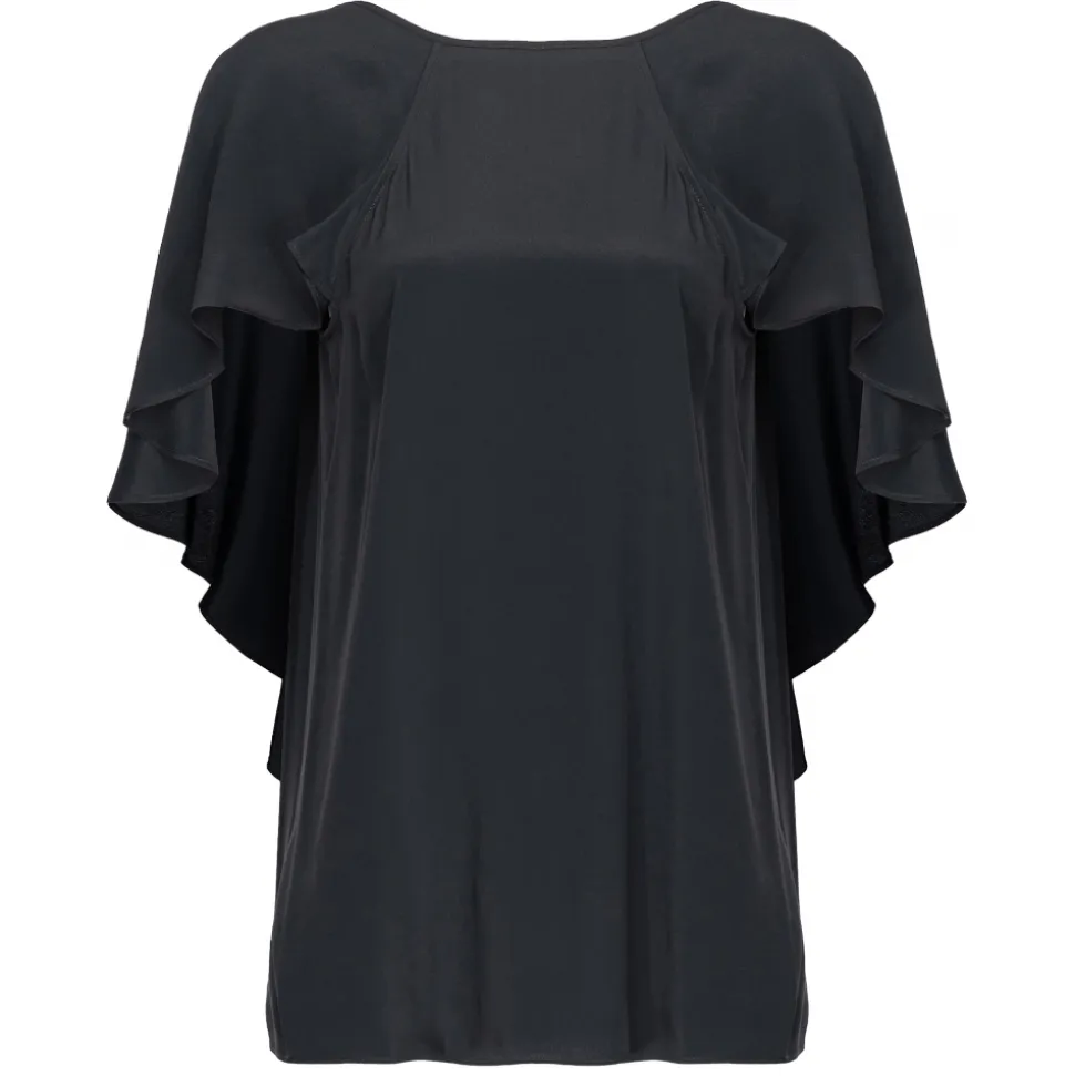 Pinko blouse in silk-blend crepe fabric with boat neckline and open back with crossed straps. Straight line with short draped sleeves with cape effect, back with maxi ruffles.