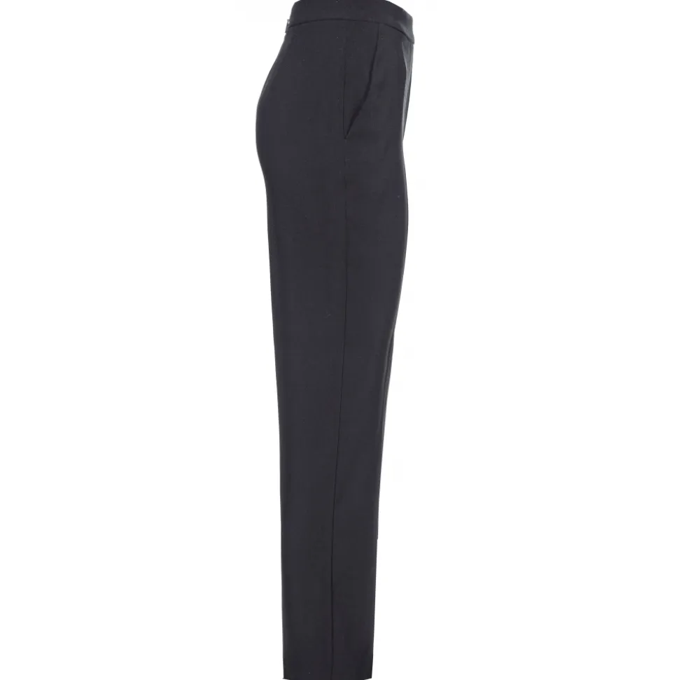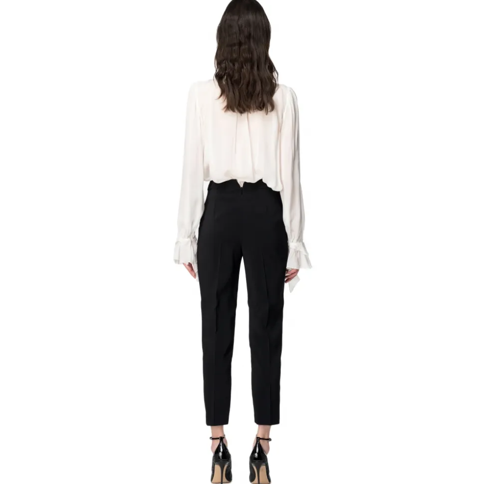 Tapered Pinko trousers in stretch crepe fabric. High waist, French pockets on the hips and slim line leg with central pleat detail on the front and back. Invisible zip fastening at the back.