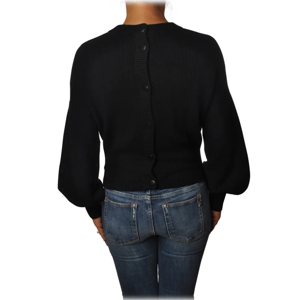 Long sleeve crewneck sweater, with button on the back and jewel brooch to be applied, entirely made of ribbed wool, Pinko.