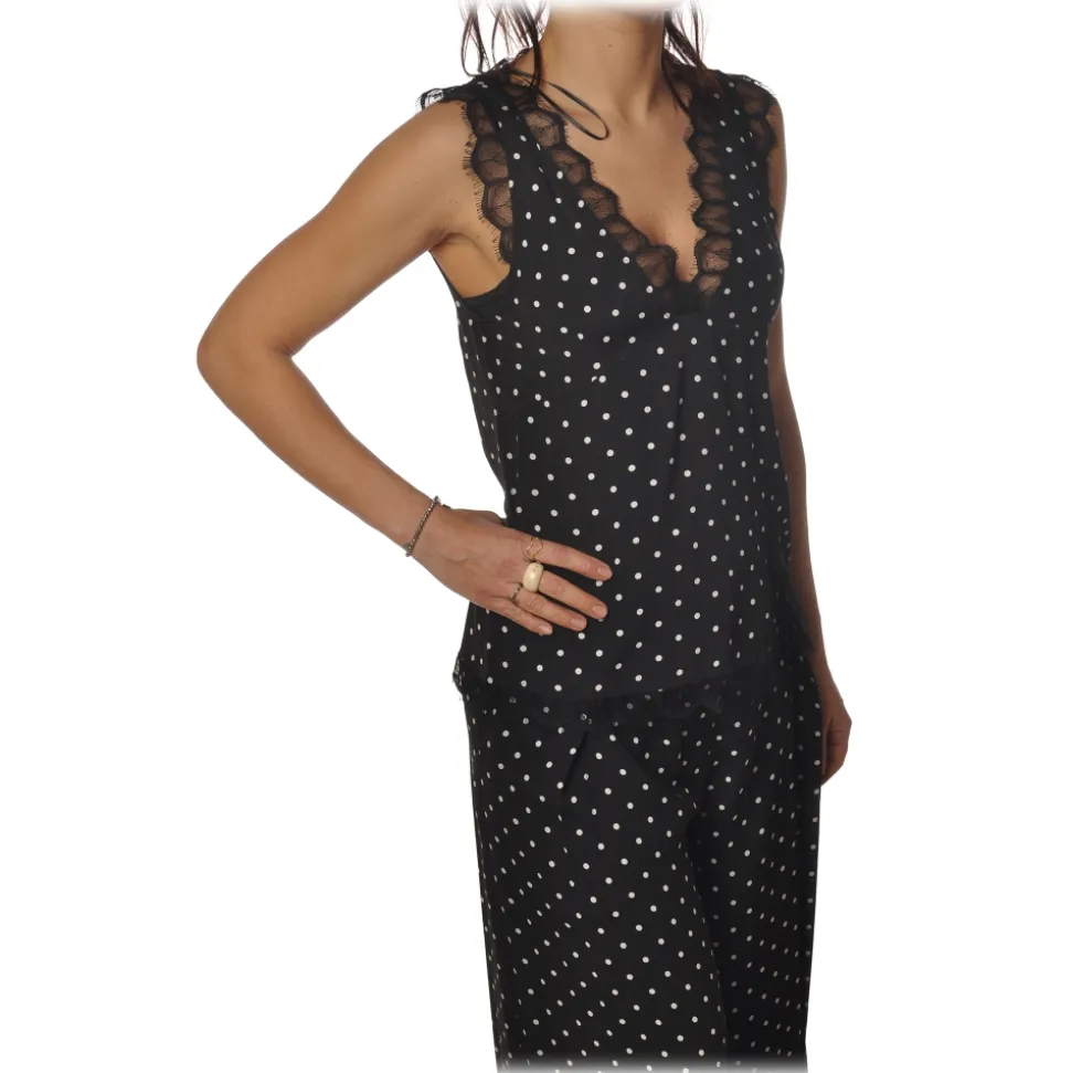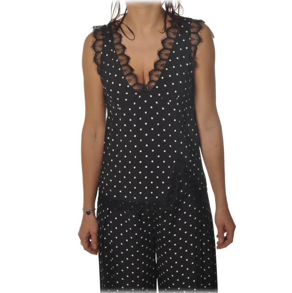 V-neck tank top, with lace borders and slit on the bottom, entirely made in Pois pattern, Pinko.