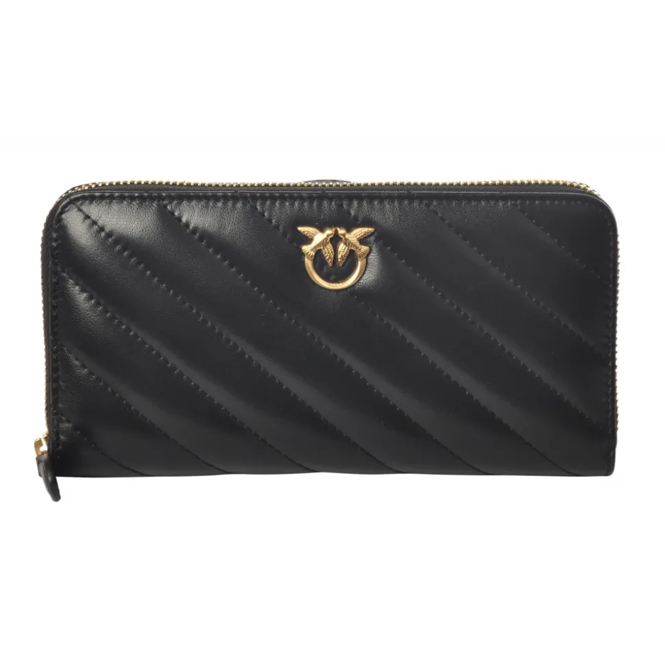 Rectangular wallet with central zip closure, entirely made of quilted leather with central double swallow logo, Pinko.