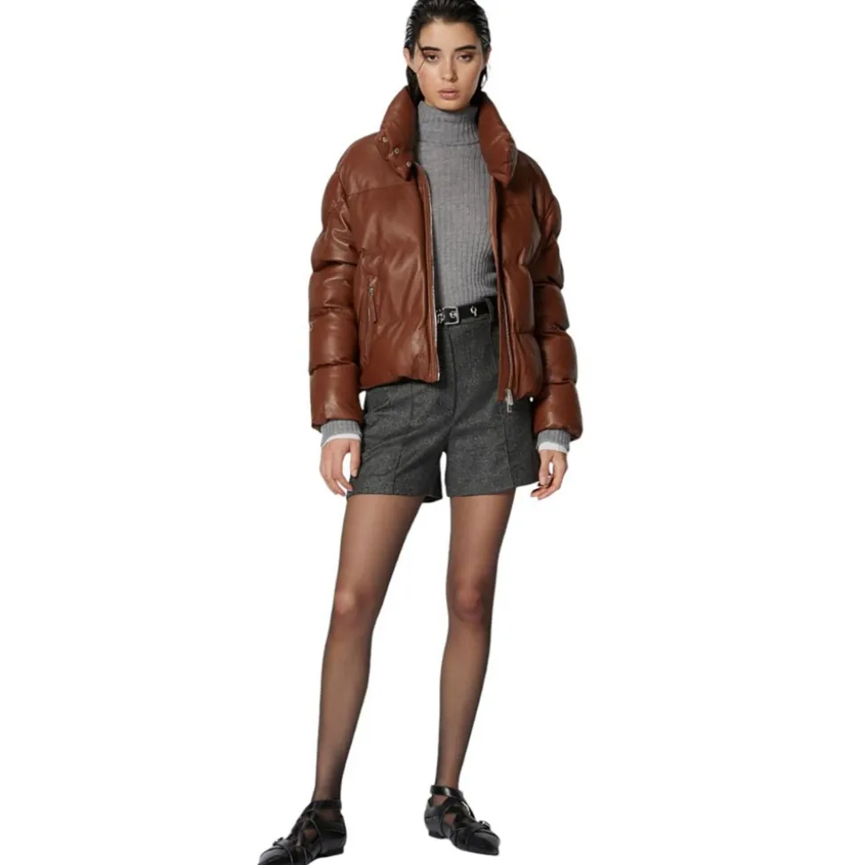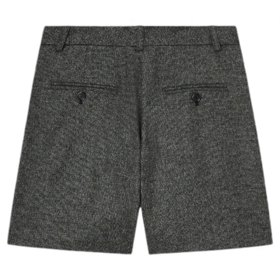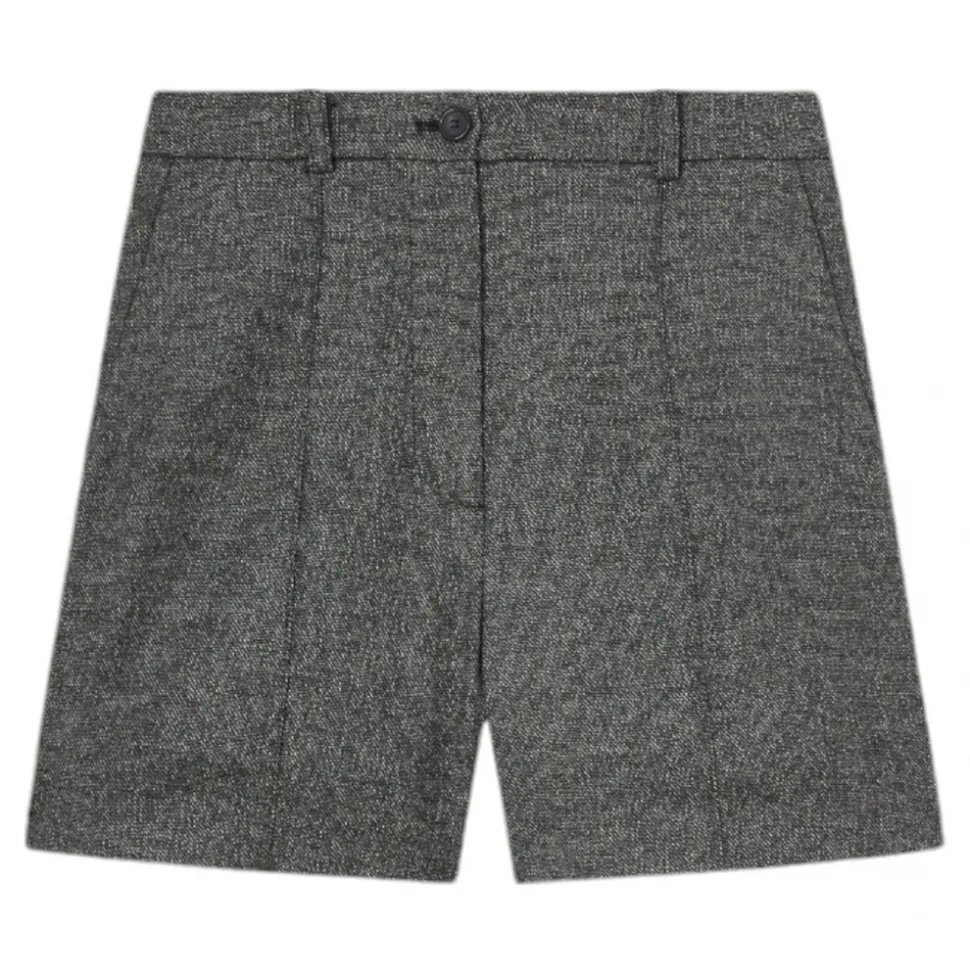 Pinko shorts, tailored cut, in wool-blend flannel, refined salt-and-pepper effect texture. Belt loops at the waist, French pockets at the hips and vertical stitching, zip and button fastening.