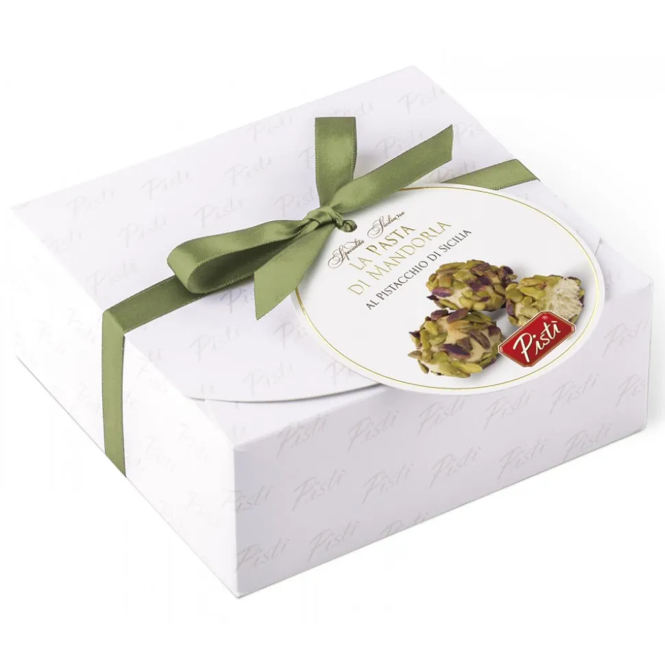 Almond paste enclosed in elegant gift boxes with bow. Proposed in three assortments made up of coated, classic or mono-flavored pastries flavored with Sicilian pistachio.