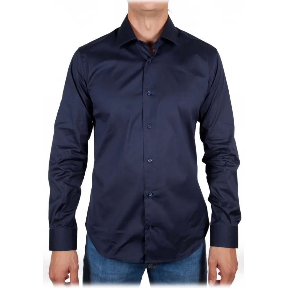 Classic blue shirt with Italian collar, slim fit sewn in the best sartorial tradition.