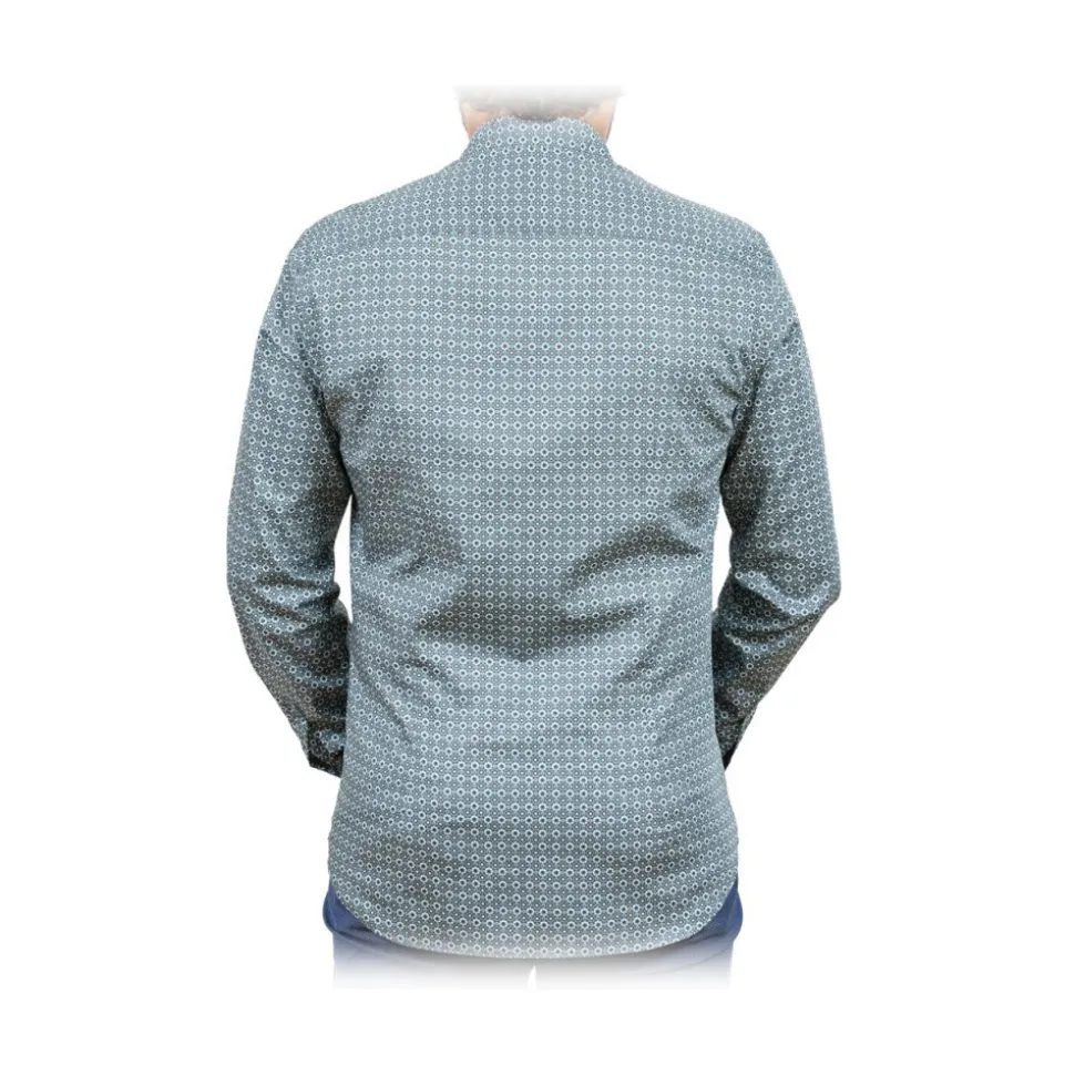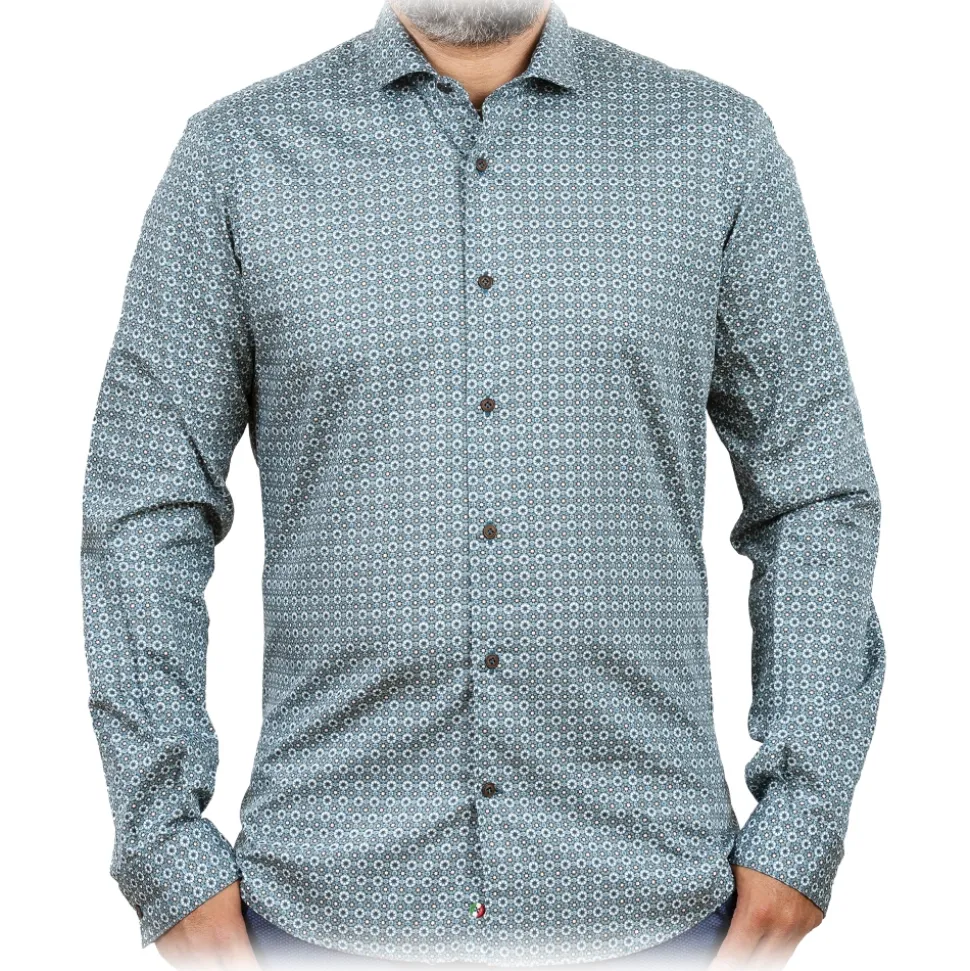 Patterned shirt with shades of green. Buttons in ton. Fabric composition 100% Cotton. Made in Italy.