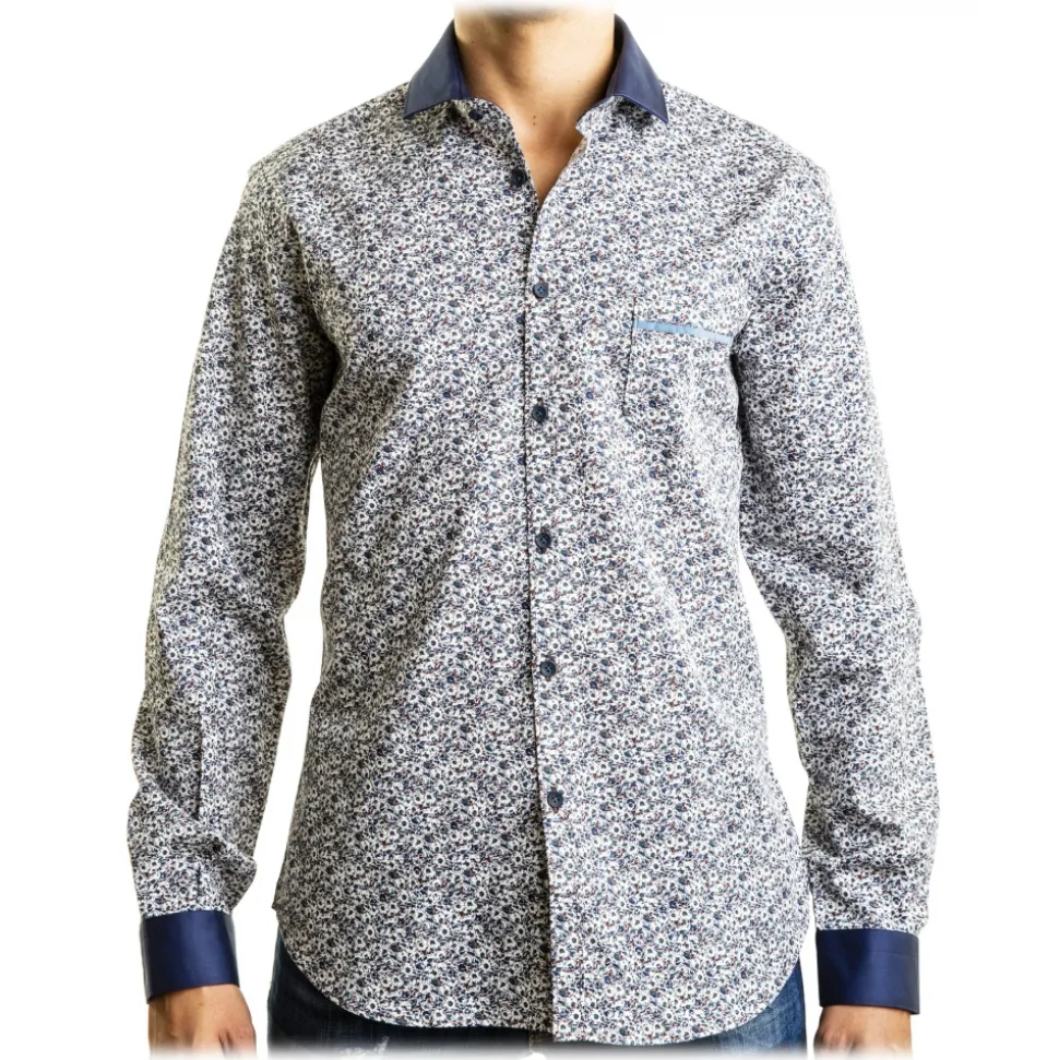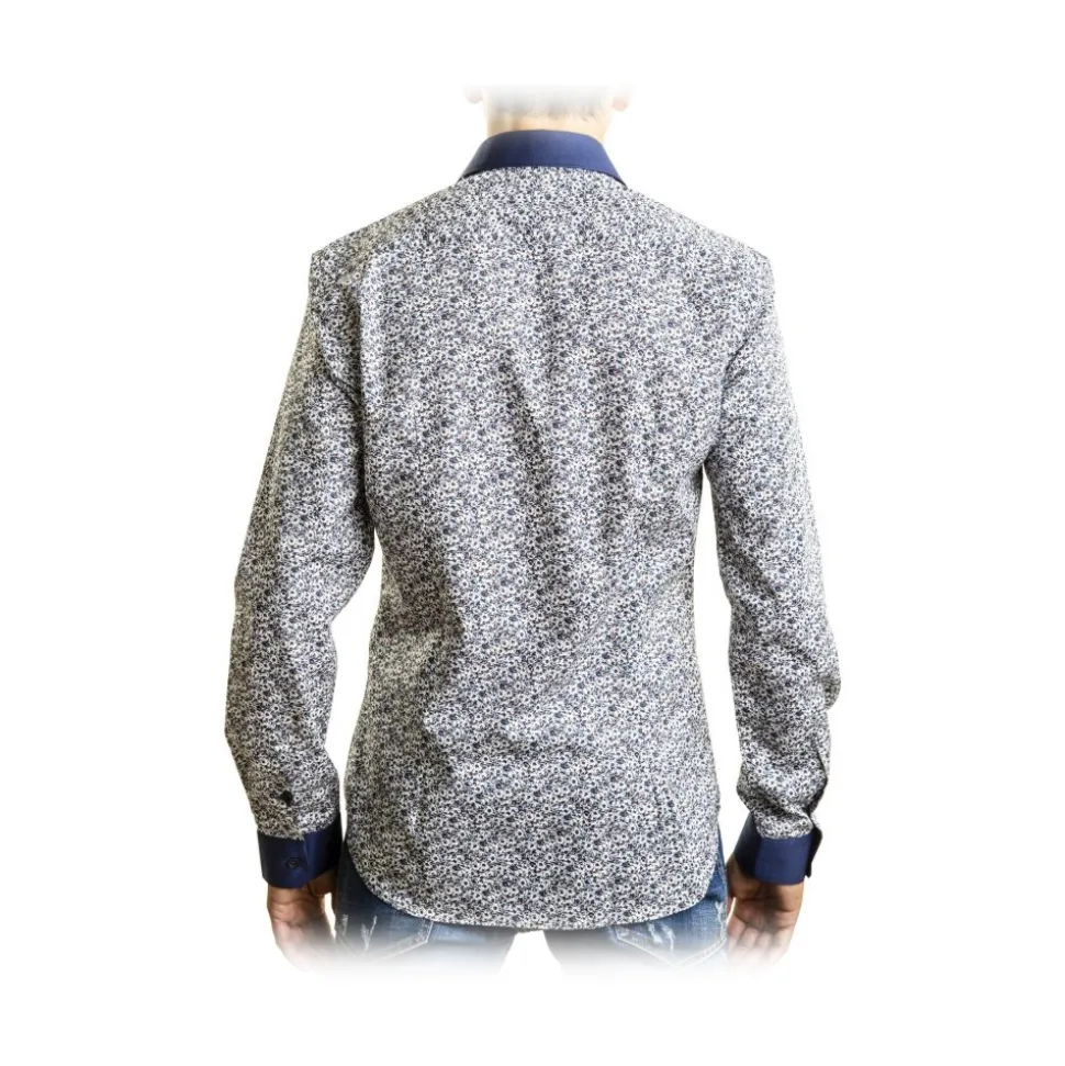 Cotonificio Albini patterned shirt with blue collar and cuffs. Buttons in tone. Fabric composition 100% Cotton. Made in Italy.