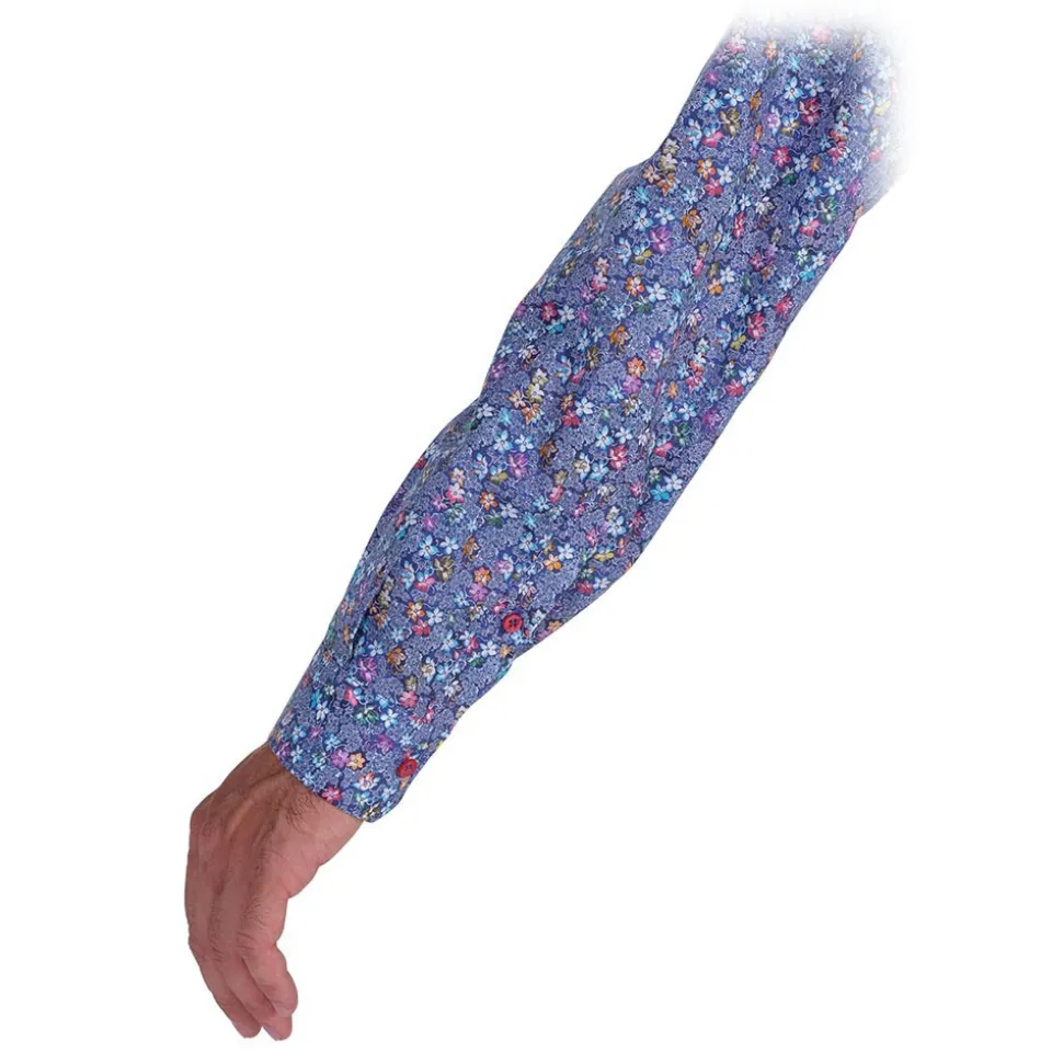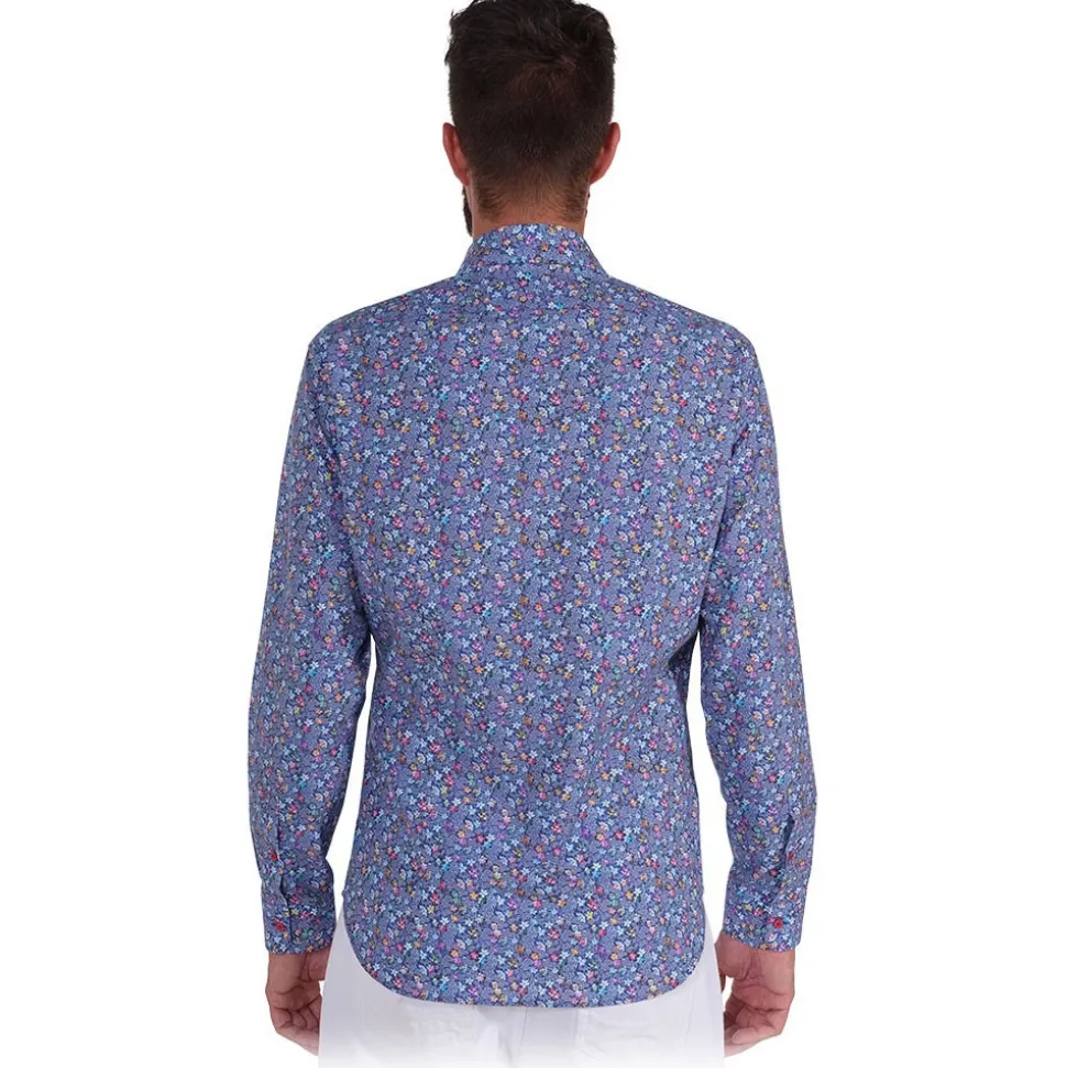 Cotton shirt printed on a poplin base with multicolor floral pattern on a light blue base. Fuchsia buttons that match the color of the design. Fabric composition 100% COTTON – Made in Italy.