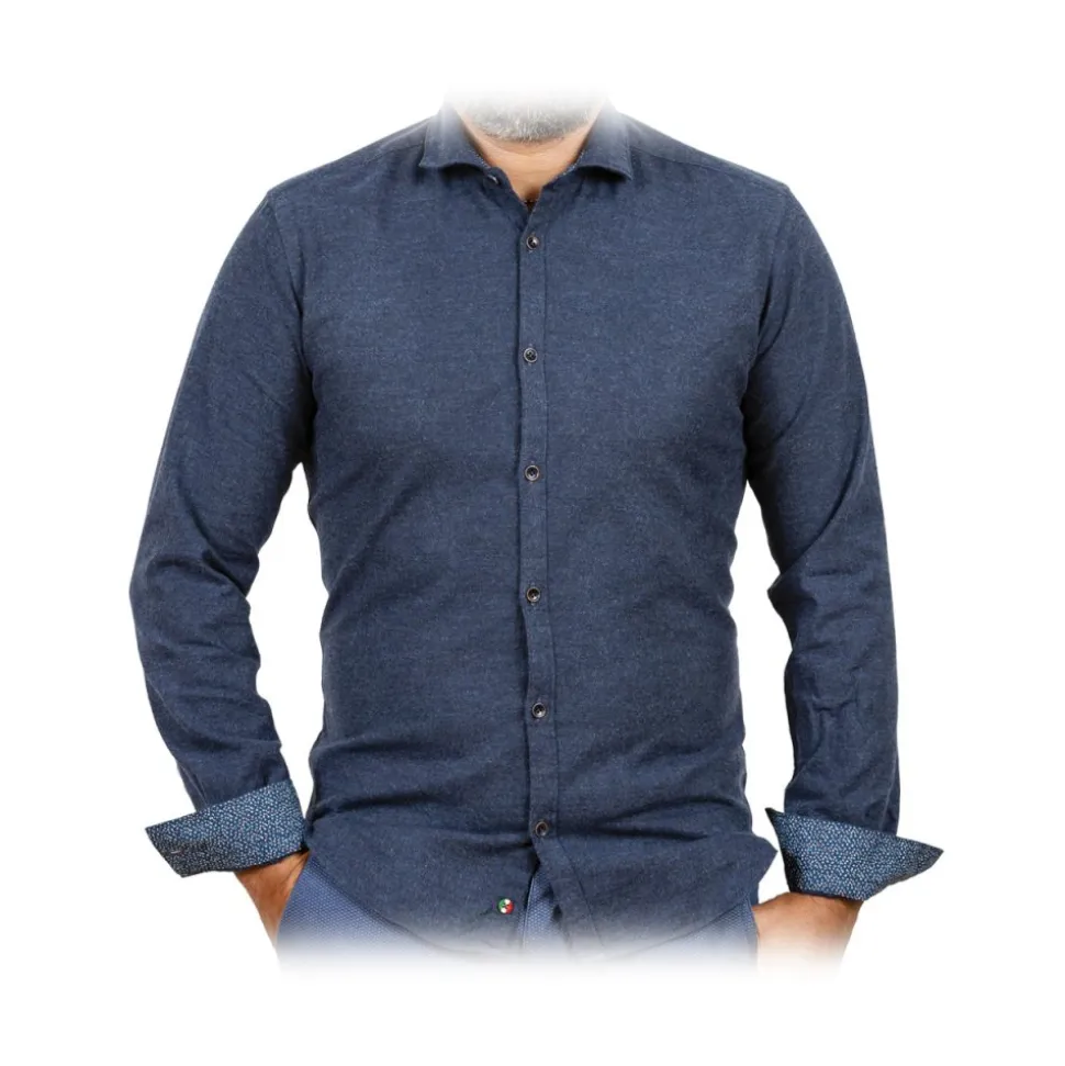 Blue flannel shirt with inner collar, inner wrist and sleeve strip with small pattern. Buttons in tone. Fabric composition 100% Cotton. Made in Italy.