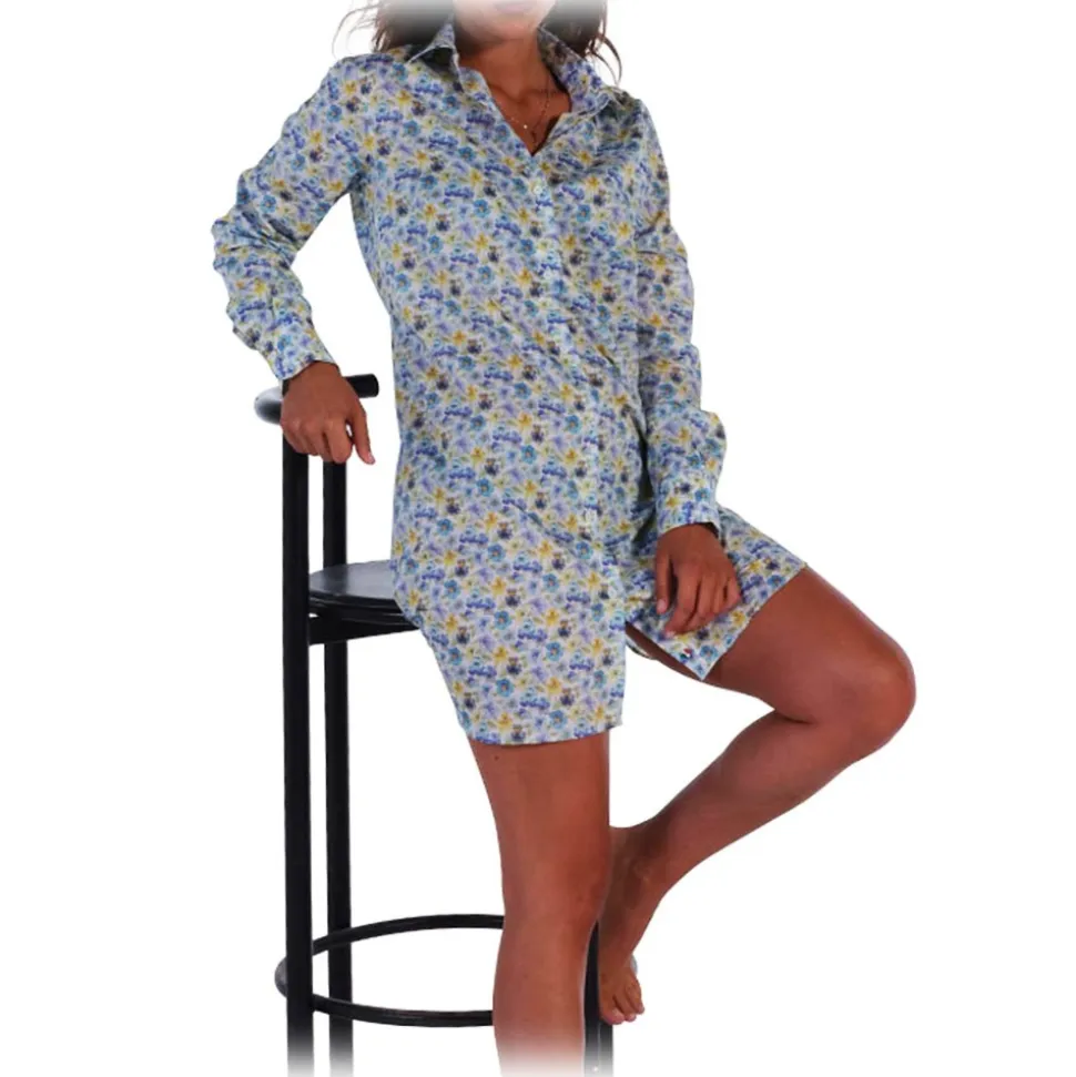 Shirt with Liberty London poplin base and floral pattern in shades of blue. Composition 100% cotton – Made in Italy.