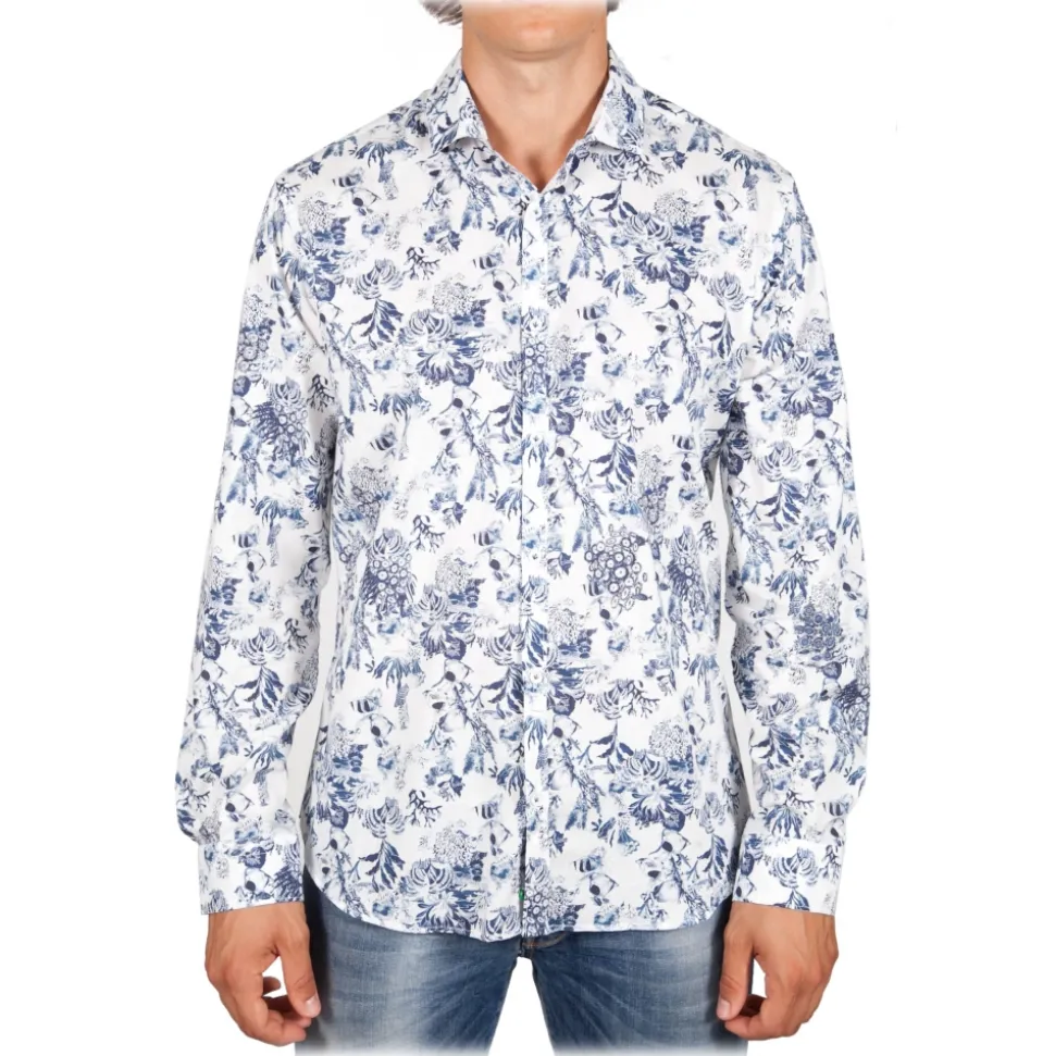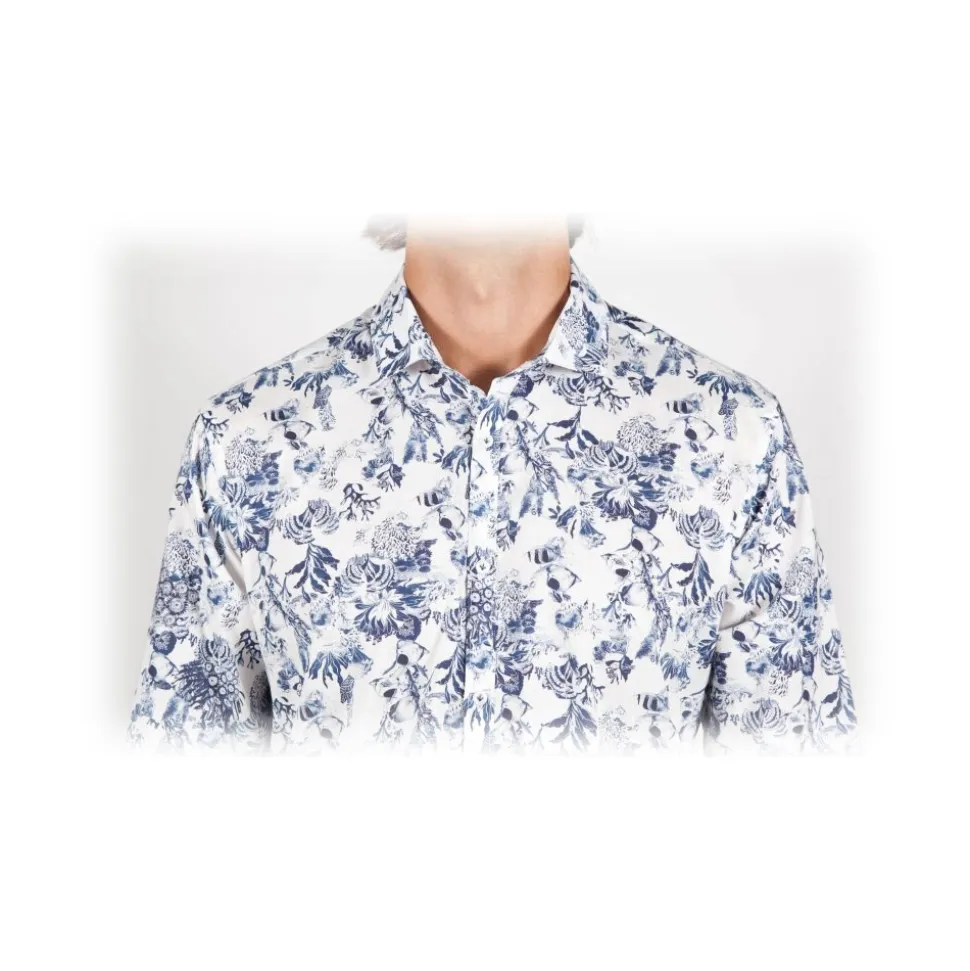 Patterned shirt with small French collar. Slim fit sewn in the best sartorial tradition.