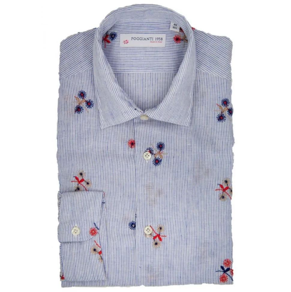 Camicia in lino/cotone con fiori ricamati sulla base bianca con righe blu. Bottoni bianchi in tono alla camicia. Composizione tessuto 55% LINO 45% COTONE – Made in italy.