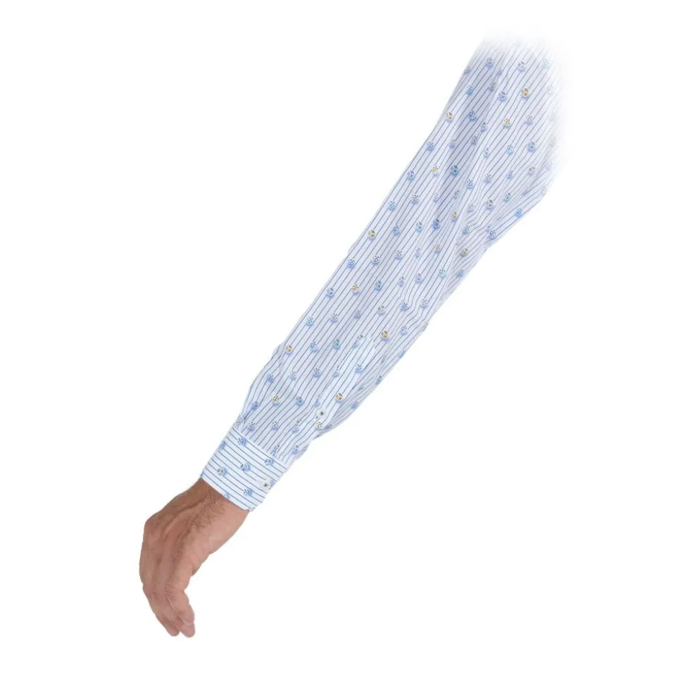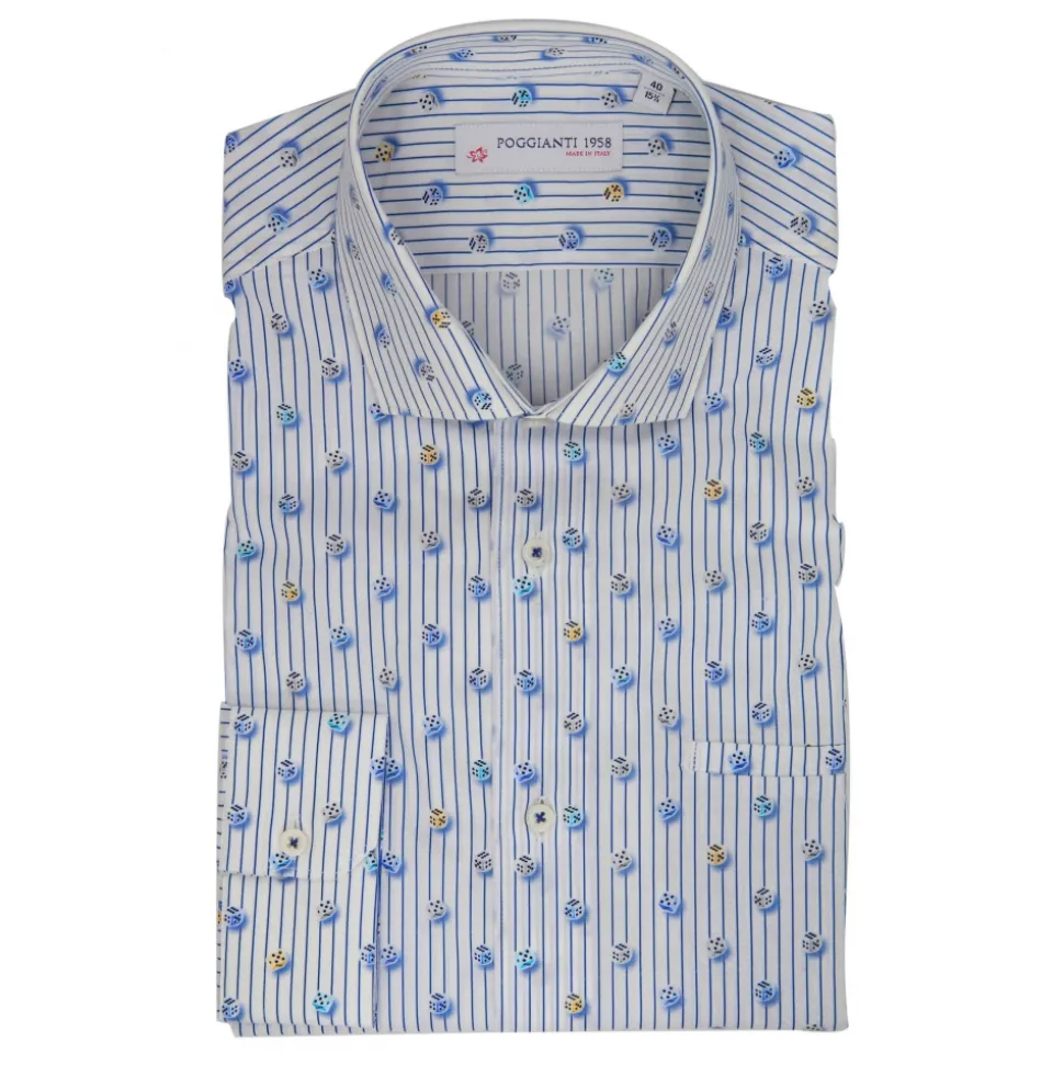 Cotton shirt with blue striped print with dice on a white poplin base. Contrast blue pattern with usual motif, inside pocket, flies on the bottom, under sail collar. White buttons in tone to the shirt .. Fabric composition 100% COTTON – Made in Italy.