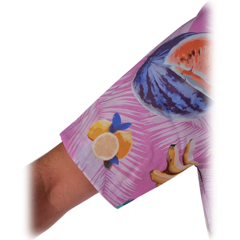 Cotton shirt with fruit print in bright colors on a pink muslin base. The buttons of this shirt are in crocodile sewn with color matched thread. Fabric composition 100% COTTON – Made in Italy