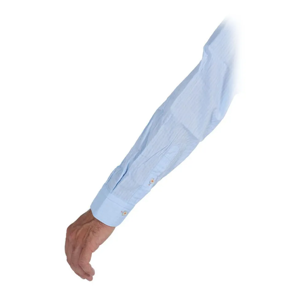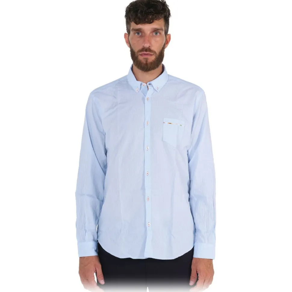 Solid color cotton shirt on seersuker fabric with embossed effect. Buttons matching the shirt, but with contrasting thread and bartack buttonhole to match the patterned fabric inside the collar and pocket. This shirt has a sporty style. Composition 100% COTTON. Made in Italy.