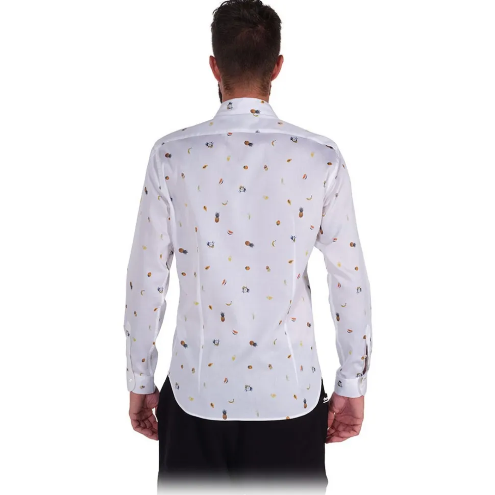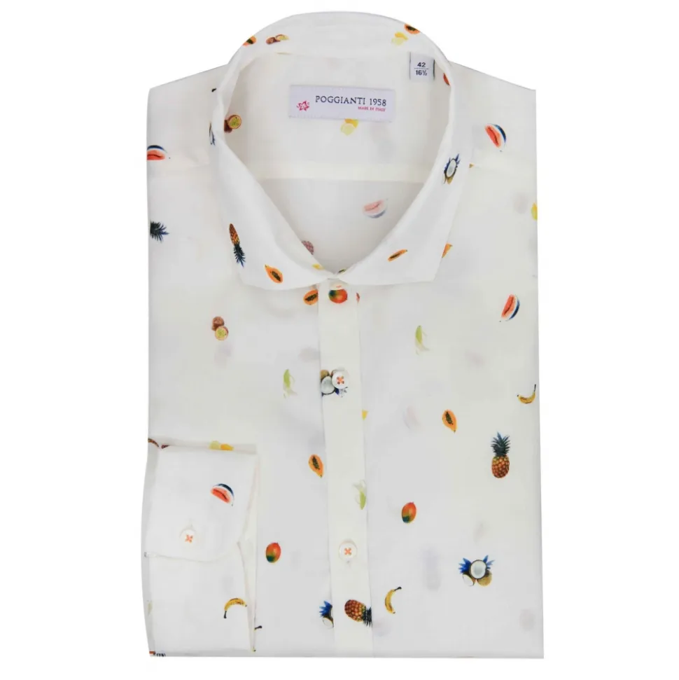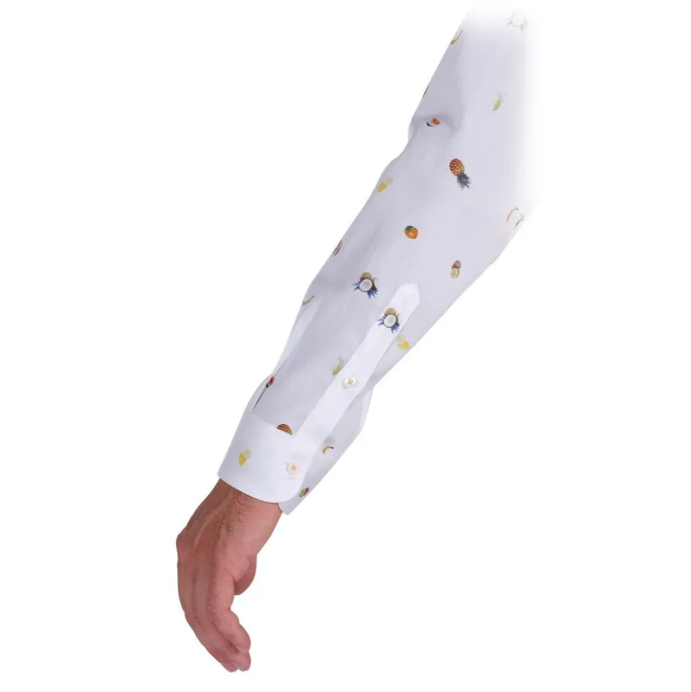 White cotton shirt with a small fruit pattern printed on a light poplin. White buttons in tone to the shirt sewn with orange thread that takes up the design. Fabric composition 100% COTTON. Made in Italy.