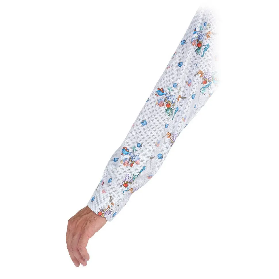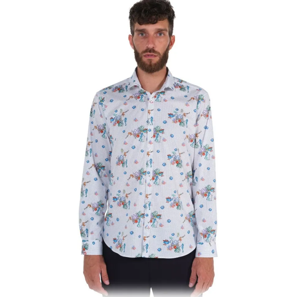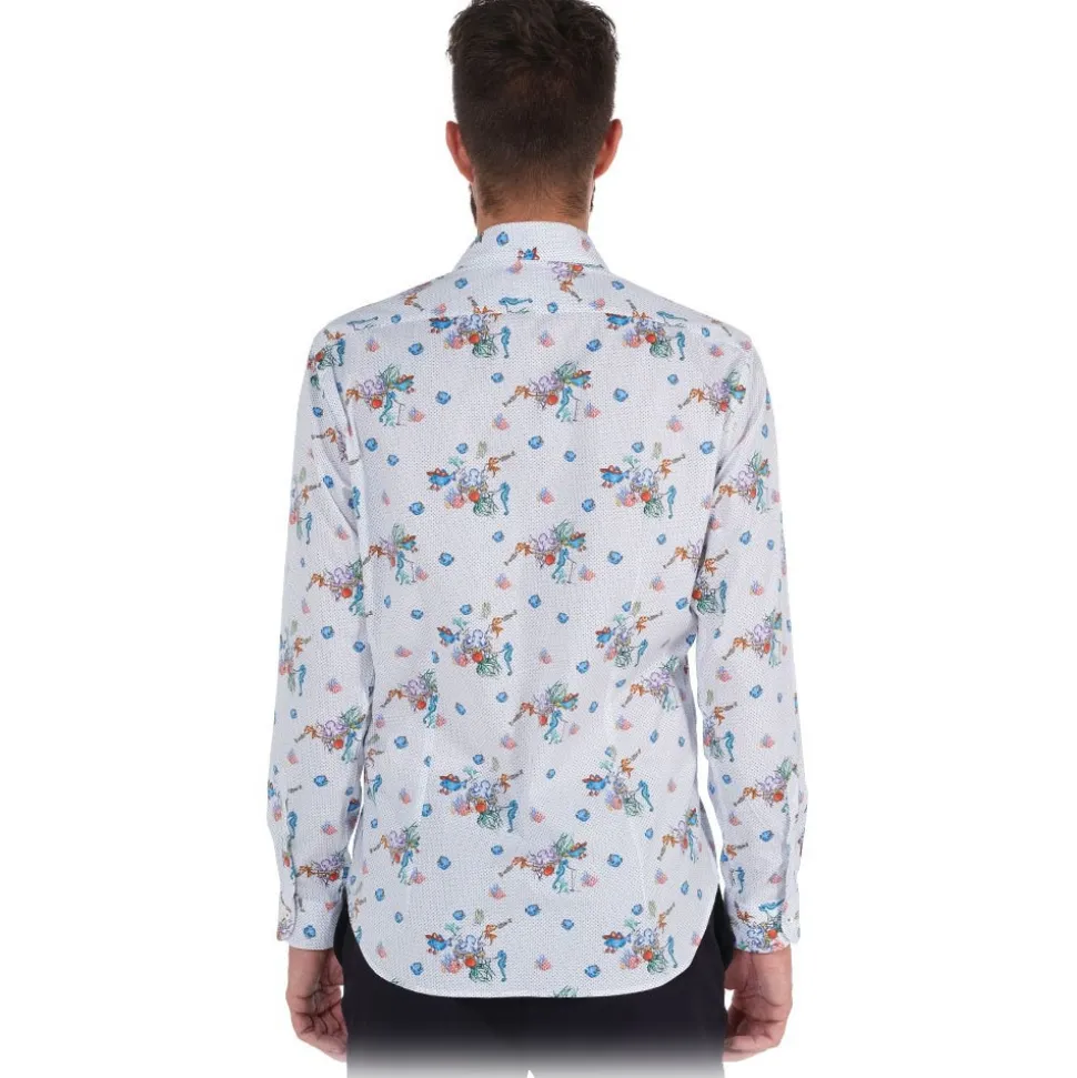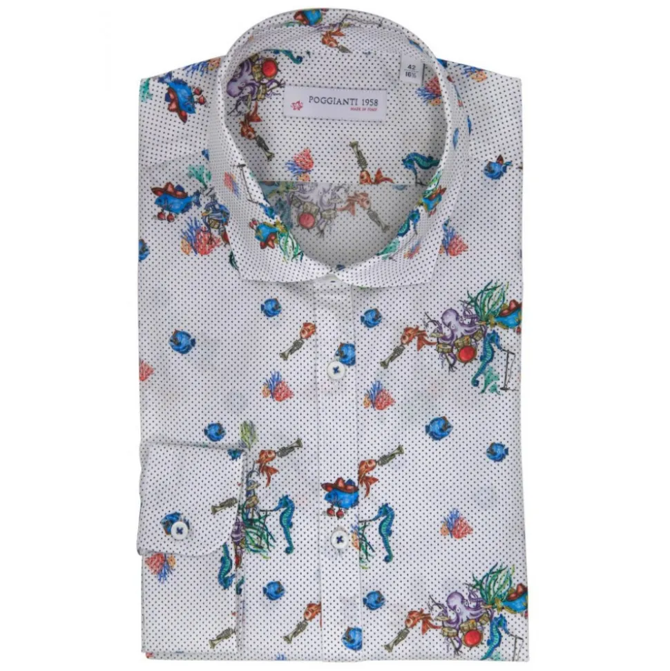 White stretch cotton shirt with small blue polka dots base and sea theme pattern printed on a poplin. White buttons in tone to the shirt sewn with blue thread to match the print. Fabric composition 97% COTTON 3% ELASTANE – Made in Italy.