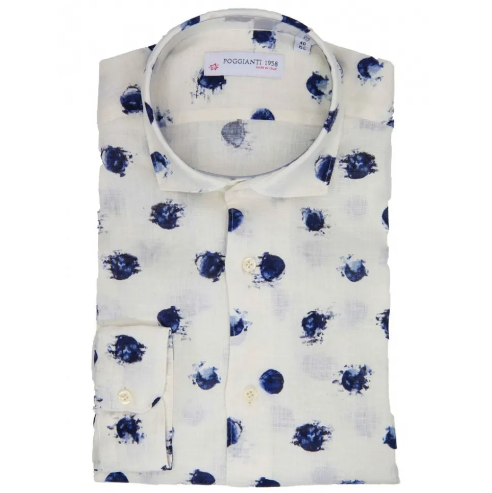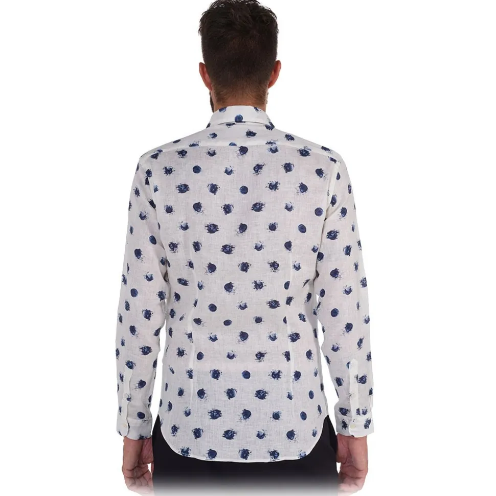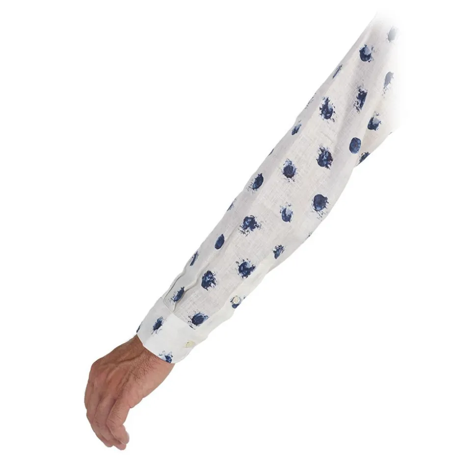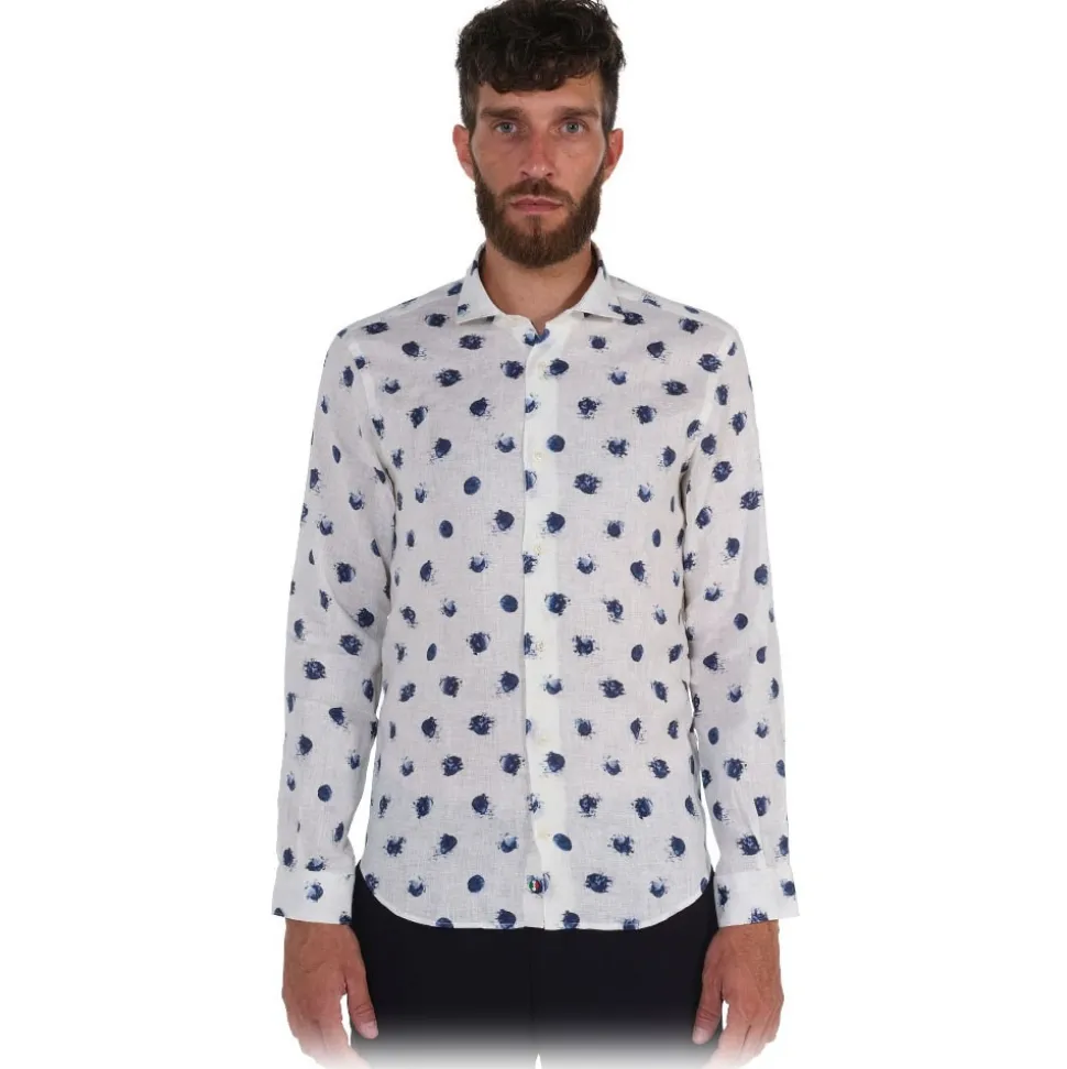 ALBINI linen shirt with white base and large blue polka dot print. White buttons in tone to the shirt. Fabric composition 100% COTTON – Made in Italy