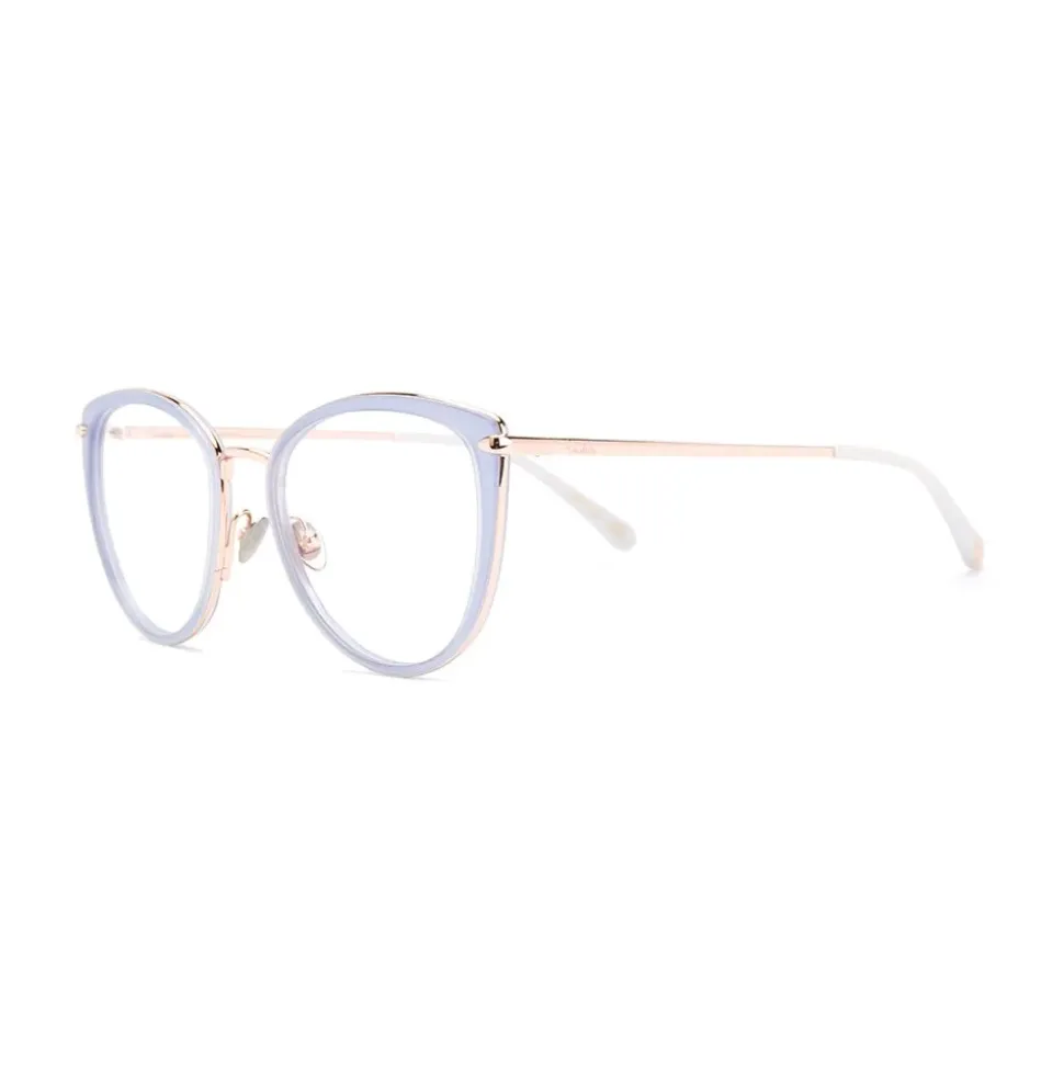 Blue unisex butterfly frame optical glasses from Pomellato Eyewear featuring oversized frames, a logo decal on the lens, nose pads, straight arms with angled tips and a gold-tone finish. These glasses can be adapted to fit all types of prescription lenses.