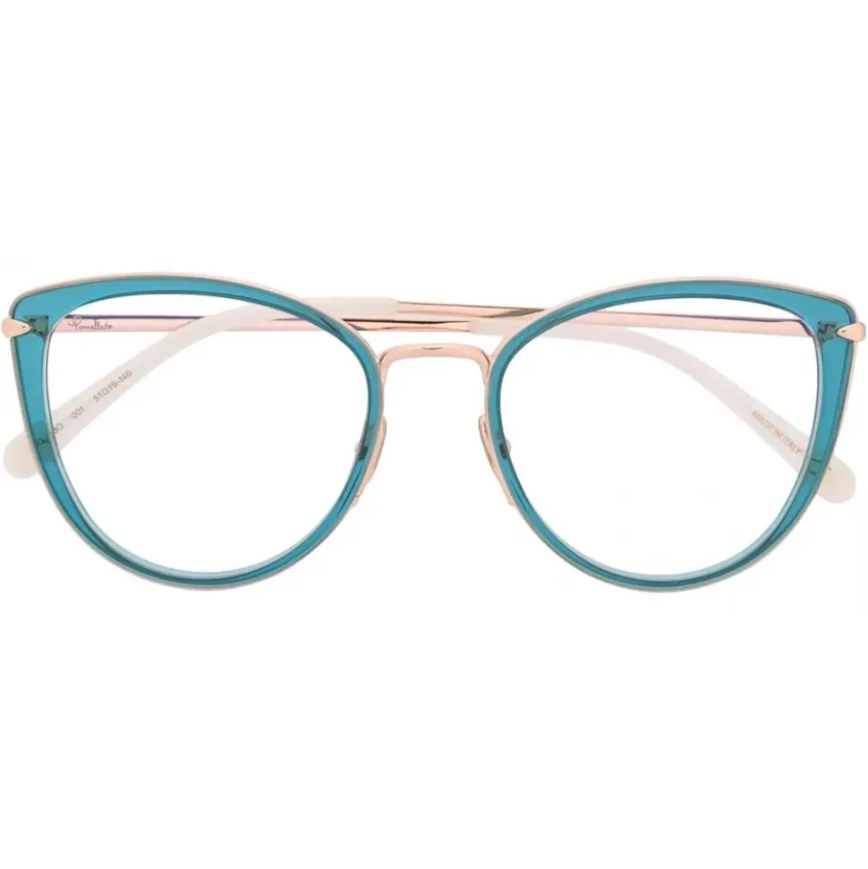 Gold-tone and blue acetate and metal two-tone cat-eye glasses from Pomellato Eyewear featuring gold-tone hardware, cat eye frames, a side embossed logo stamp, a straight bridge and straight arms with curved tips. This item comes with a protective case.