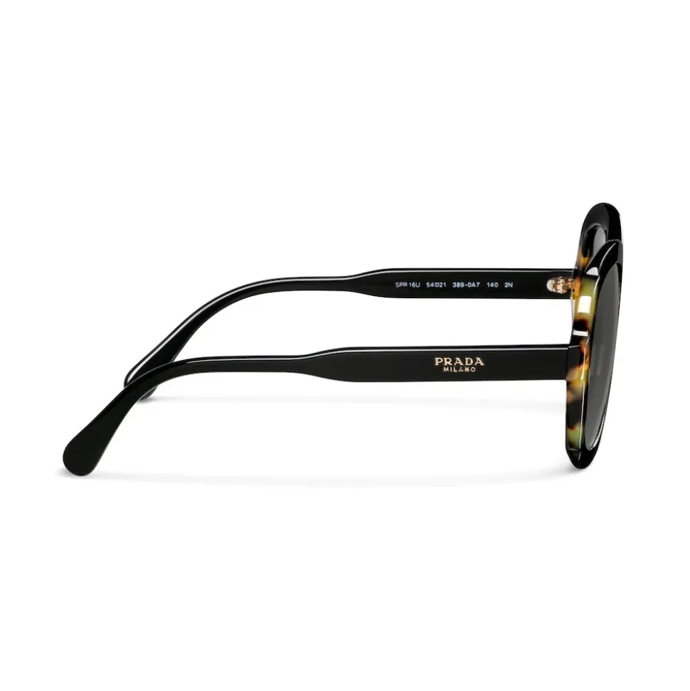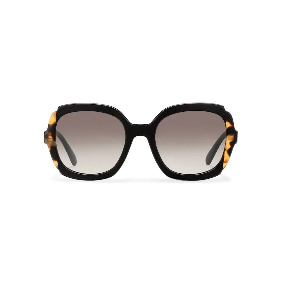 Sophisticated oversized frame front with two-tone silhouette. Distinctive side inserts with contrasting cut-out effect. Prada lettering logo.