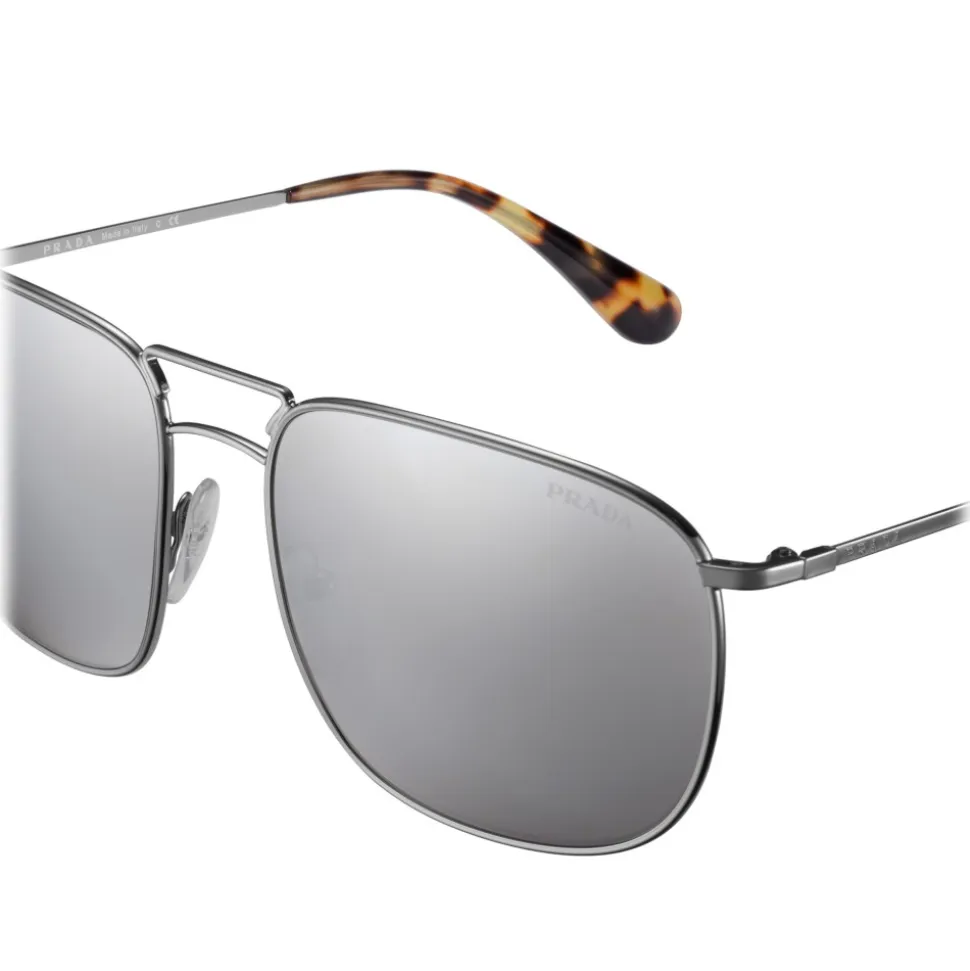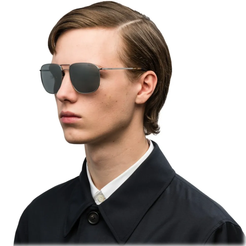 PE ’17 Advertising Campaign Model. Men’s sunglasses with a classic design. Squared lenses with profiles and double metal bridge. Ultra-thin metal rods with acetate ends. Logo Prada Lettering.