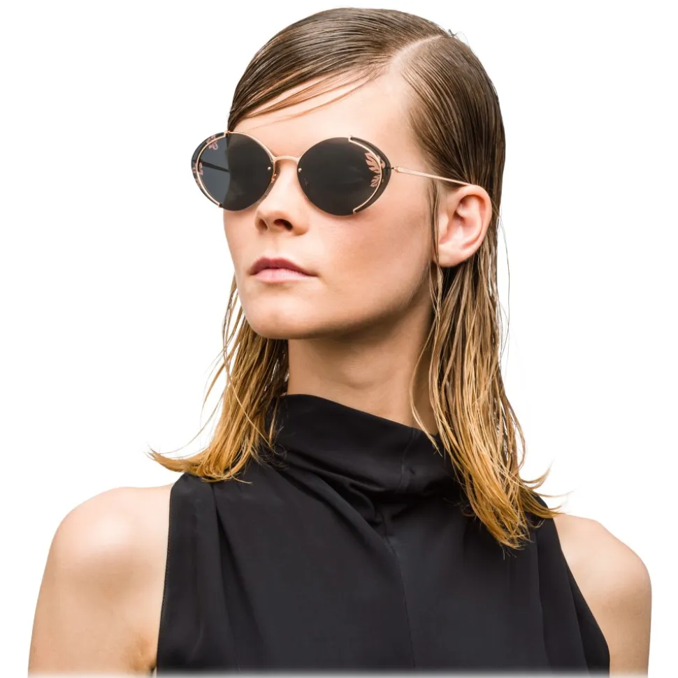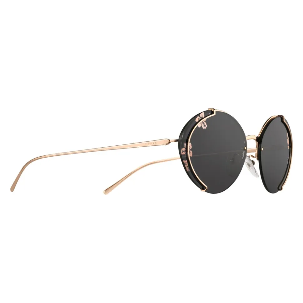 Oval silhouette with minimalist and sophisticated appeal. Rimless and flat lenses with elegant profiles in polished metal that lend design. Ultrathin rods with Prada logo engraved lettering.