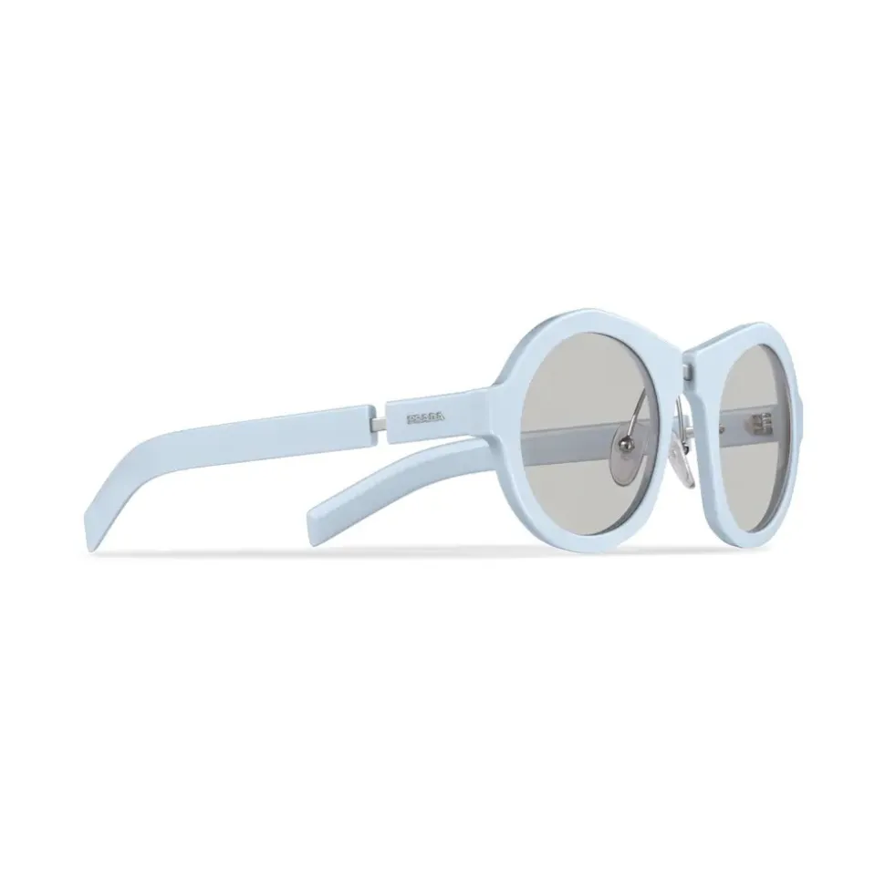 These round acetate sunglasses are characterized by their thick rims, geometric lines and metal details that interrupt the linearity of the frame front and temples. Prada lettering logo.