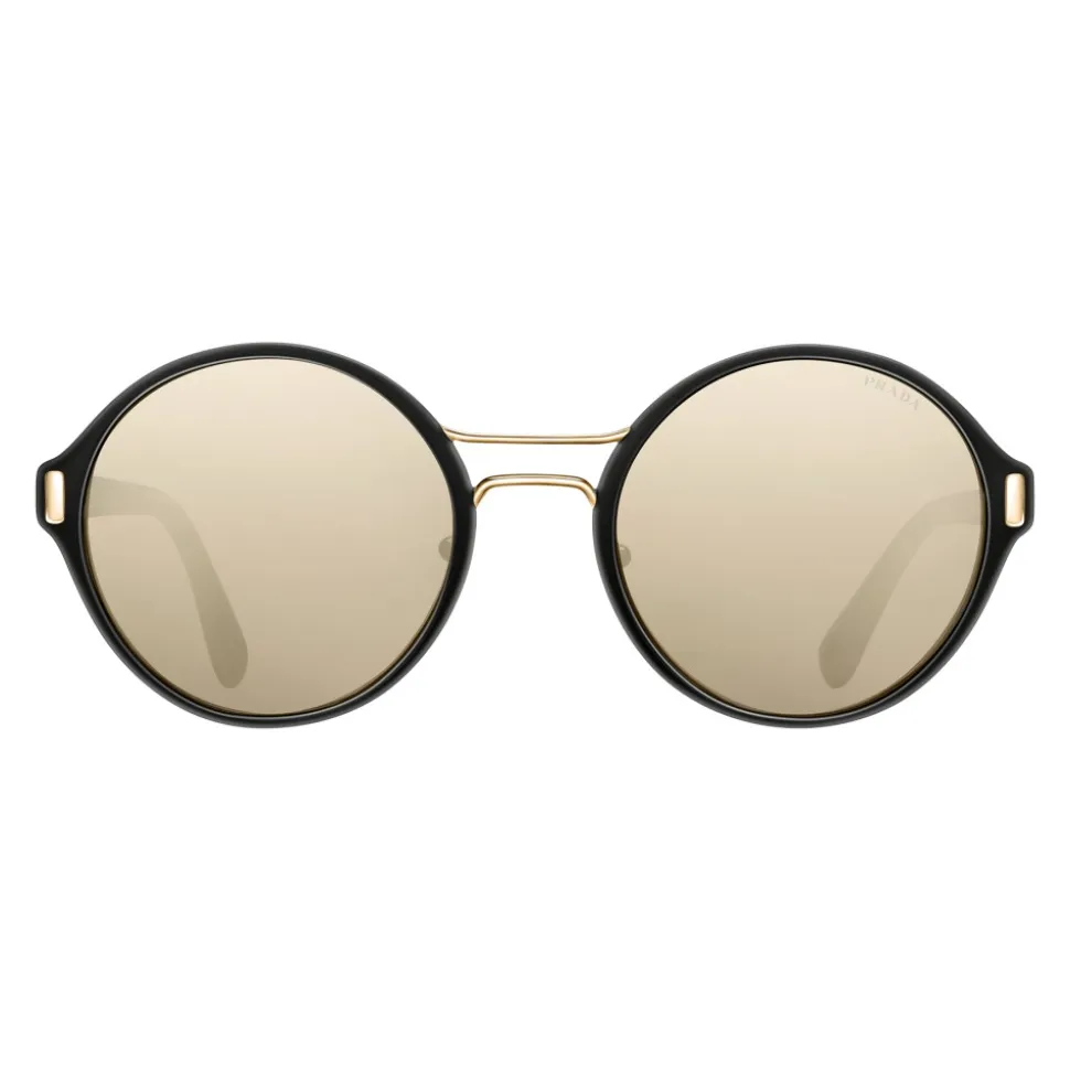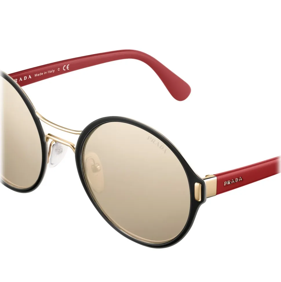 Female sun model with round silhouette. The enamelled front is enriched by a sophisticated double metal bridge and the distinctive rectangular inserts functional to the temples. Logo Prada Lettering.