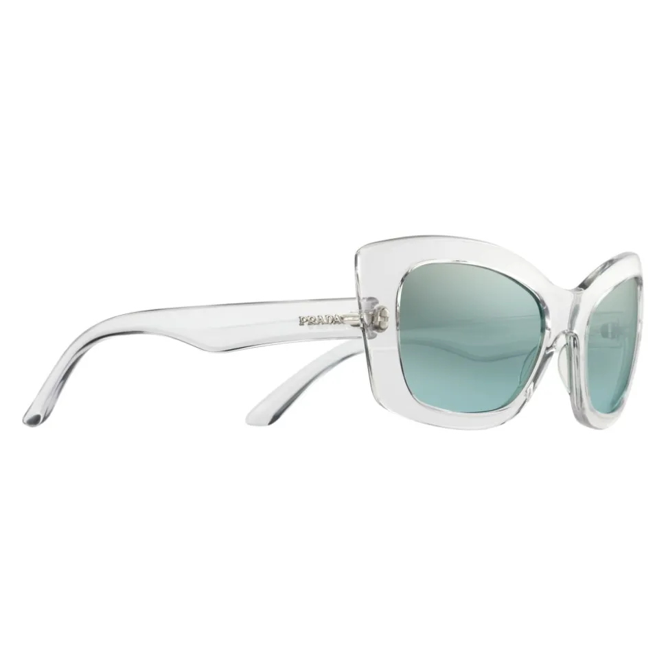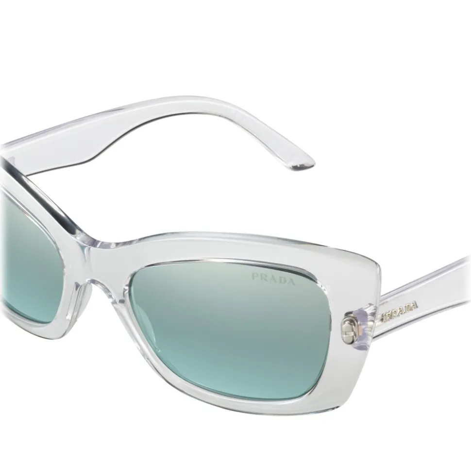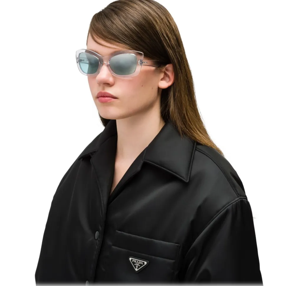 Pre-Fall Advertising Campaign Model 18. Exclusive re-edition of the iconic Prada Postcard, presented with a matching sunglasses case. Cat frontal badge made of transparent nylon and matching lenses.