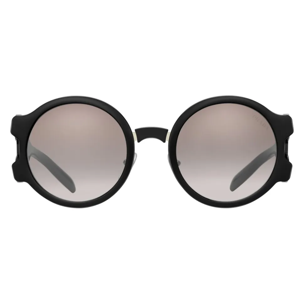Eyewear Prada Tapestry with distinctive round silhouette with retro references. Bold and sinuous temples with cut-out details and colored rubber inserts. Bridge embedded at the front with elegant metal details. Logo Prada Lettering.