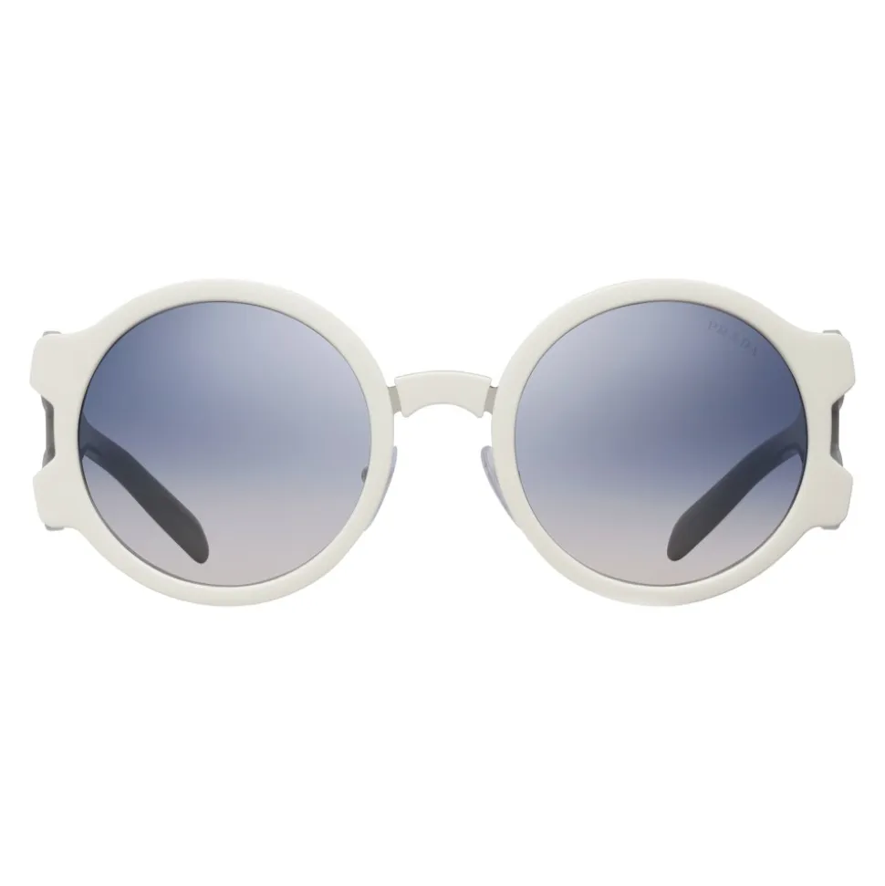 Eyewear Prada Tapestry with distinctive round silhouette with retro references. Bold and sinuous temples with cut-out details and colored rubber inserts. Bridge embedded at the front with elegant metal details. Logo Prada Lettering.