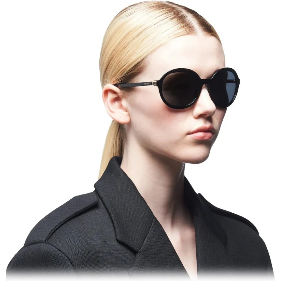 This eyewear with timeless elegance features an oversized, slightly curved round frame front with refined metal inserts on the temples. Prada lettering logo.