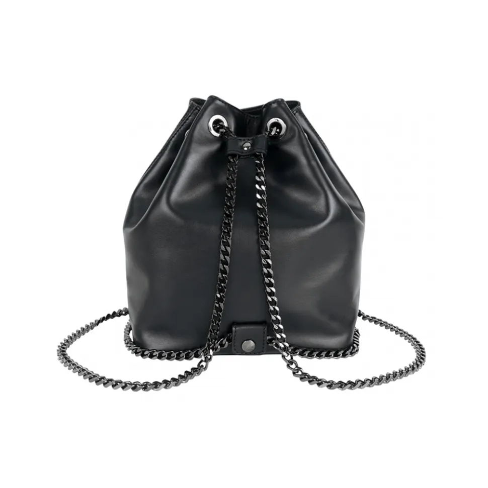 The Back for Good backpack is made of fine natural calf leather, a bucket model with a refined brass chain with diamond edges. Elegant and versatile, Back for Good can also be worn as a shoulder bag thanks to a practical leather flap with press studs placed in the back that secure the chain when used as a backpack. Equipped with a small external pocket with magnetic closure, the Priscilla Dinamo backpack has a leather interior with a zip pocket, mobile phone pocket, and a key ring with a carabiner. Metal details in gunmetal color.