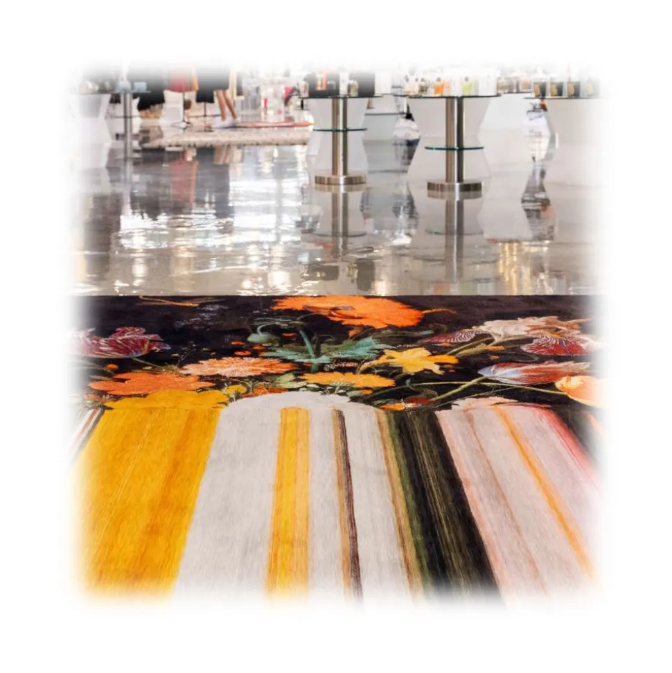 Images of charming coloured flowers are stretched in lines to reveal their beautiful colours. It is as if the image of the flowers is not downloaded correct on your computer screen. The traditional floral pattern meets the digital age. The refined colours enrich any space.